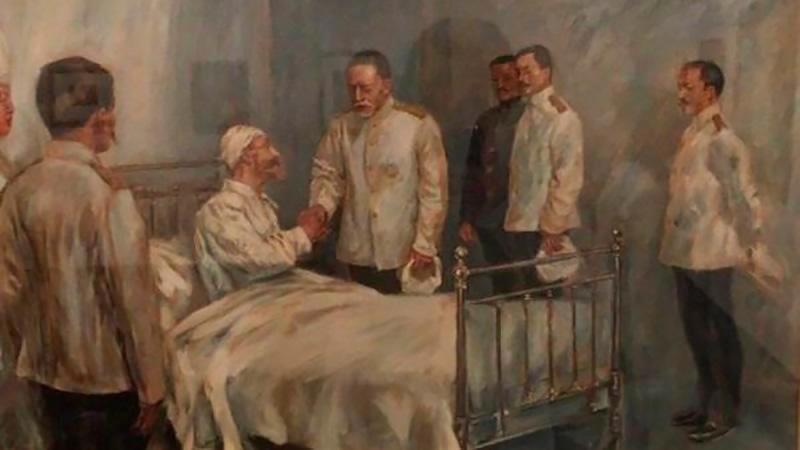 Раненного в Цусимском бою адмирала Рожественского посещает в госпитале победитель - адмирал Того...