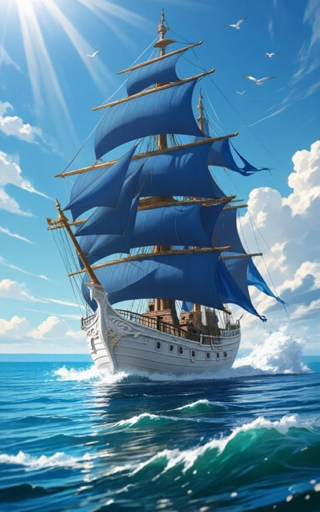 Я глянул туда, куда она указывала, и не смог поднять челюсть - к нашему порту буквально летел красивый корабль с белыми и синими парусами! Я такой скорости никогда еще не видел!