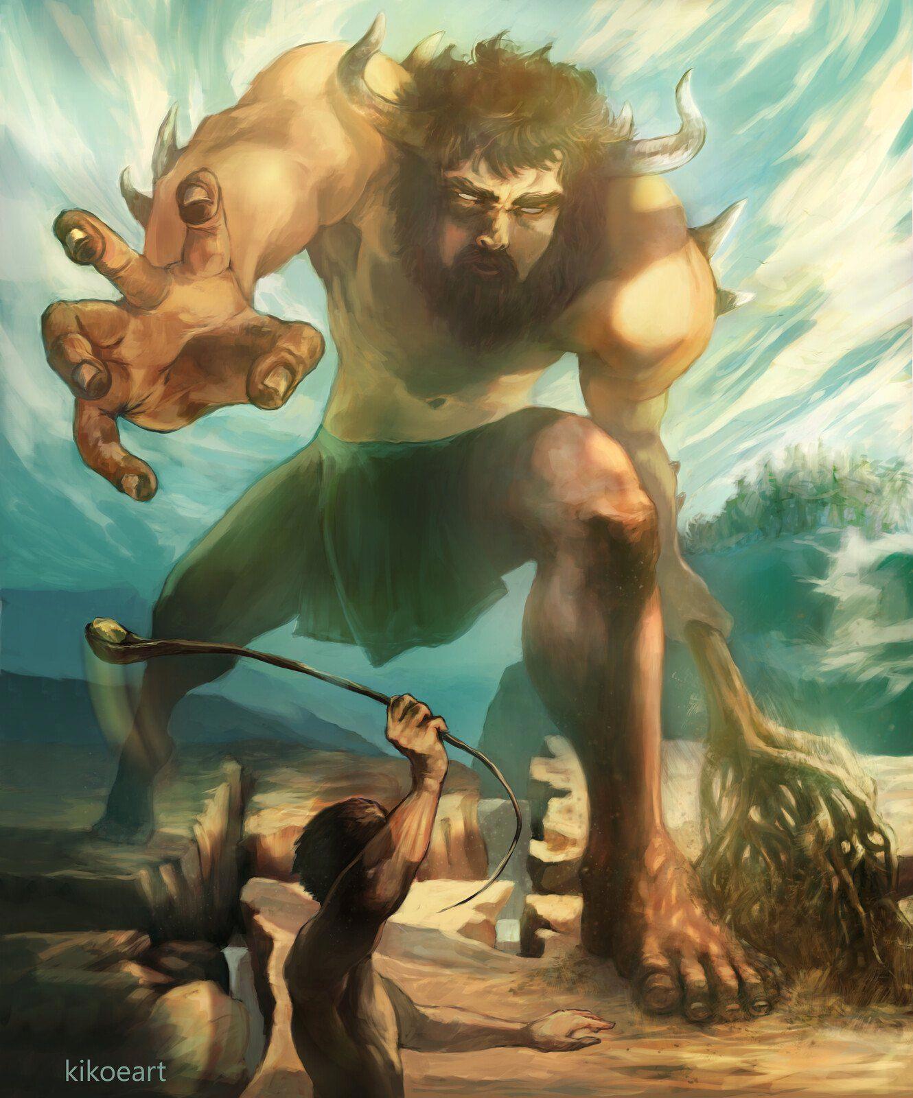 Приблизившись к входу в ущелье, юноша подобрал оставленные им загодя три дротика. Расчётливо стал метать их в гигантов, нанося раны, чтобы предельно разъярить их, но не лишить возможности передвигаться. Потом ринулся вперёд по ущелью изо всех сил. С криками великаны устремились вслед за обидчиком…