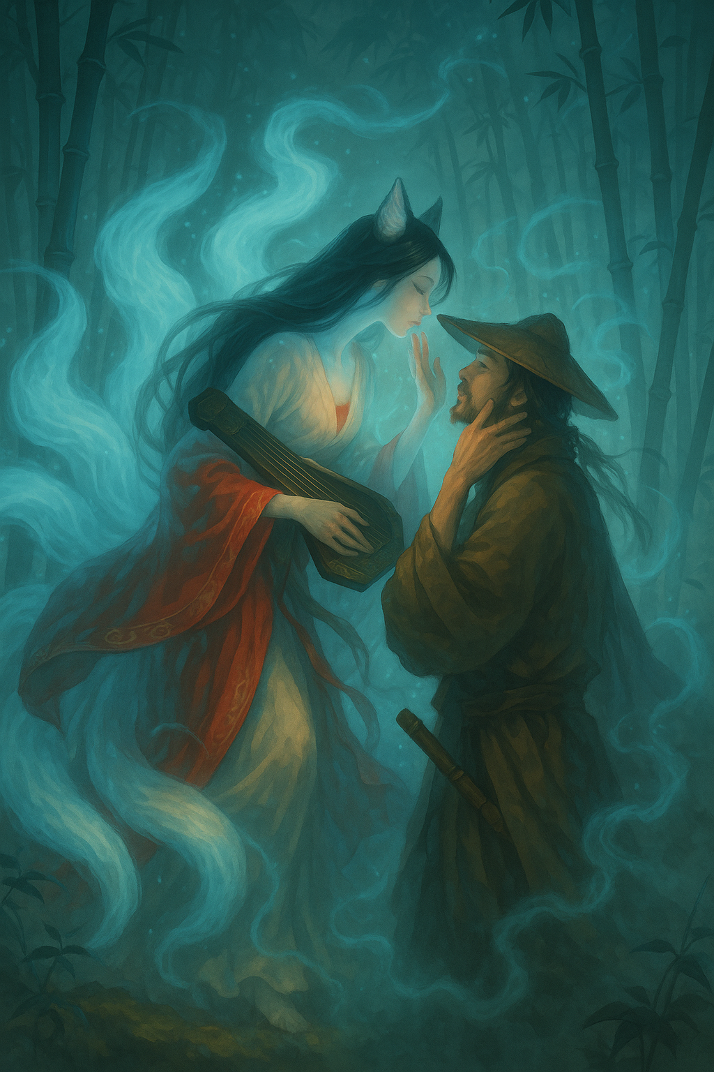 И тогда ветер поднялся. Бамбук зашелестел, как шелковые веера, вздымая туман в воздух. И среди этого белого безмолвия, среди шёпота листьев, две тени растворились, уносясь вглубь Лунного леса, туда, где ни охотники, ни боги не смеют ступить.