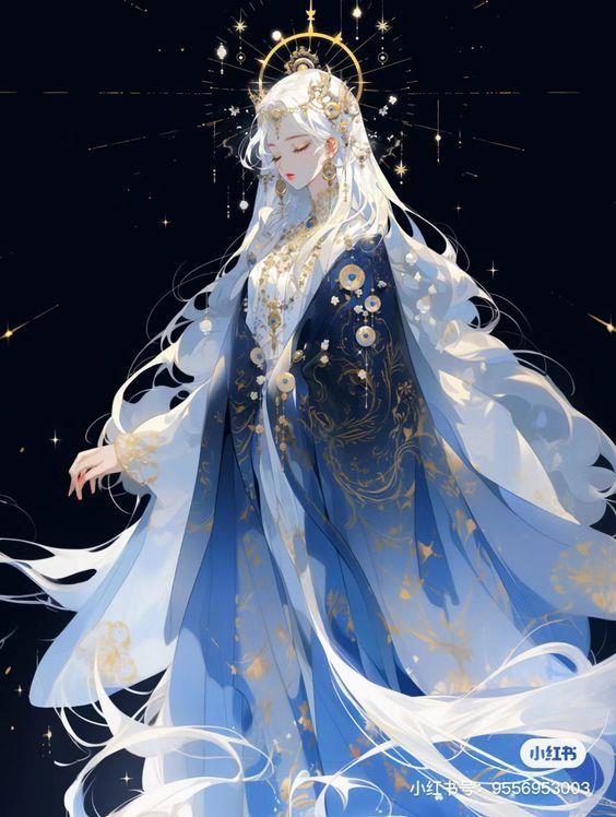 Энигма предстает в облике дивной девы, чьи волосы, цвета лунного света, ниспадают до самой талии, а в омуте чёрных глаз отражается бездонная глубина космоса, полная тайн и неразгаданных загадок. В её взоре – вечность, в её прикосновении – судьба.
