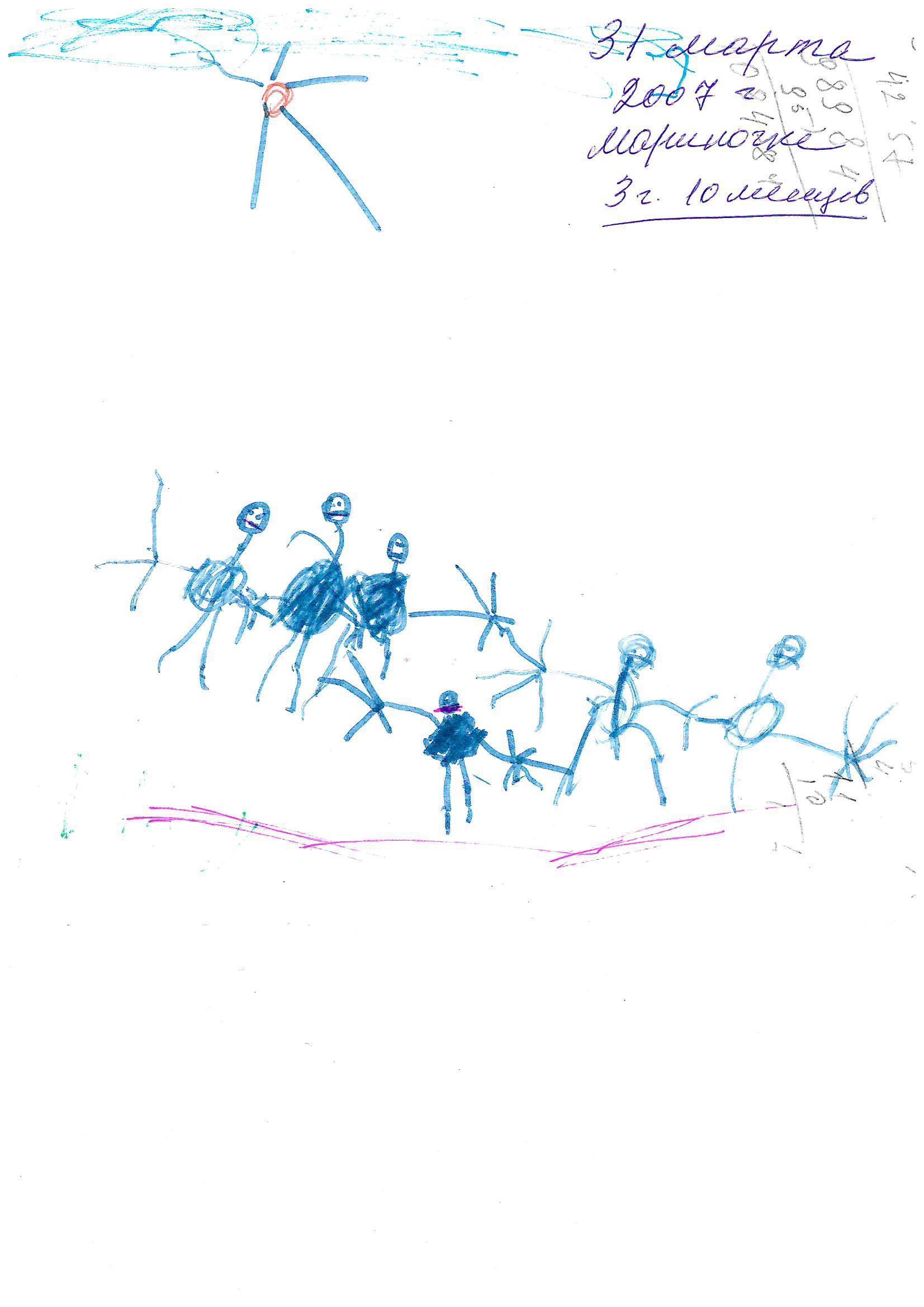 Картина, созданная Мариночкой 31 марта 2007 года, когда ей было 3 года и 10 месяцев, представляет собой интересное сочетание простоты и фантазии.