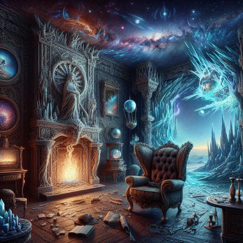 В камине потрескивал небольшой мистический огонёк, прогоняя холод из старинного дома, застывшего словно во времени и оторванного от реальности. Сквозь стены проникали странные звуки — то непонятный писк, то жуткий гул, заставлявшие дрожать предметы в комнате. Но, несмотря на колебания, потусторонние наросты удерживали всё на своих местах.
