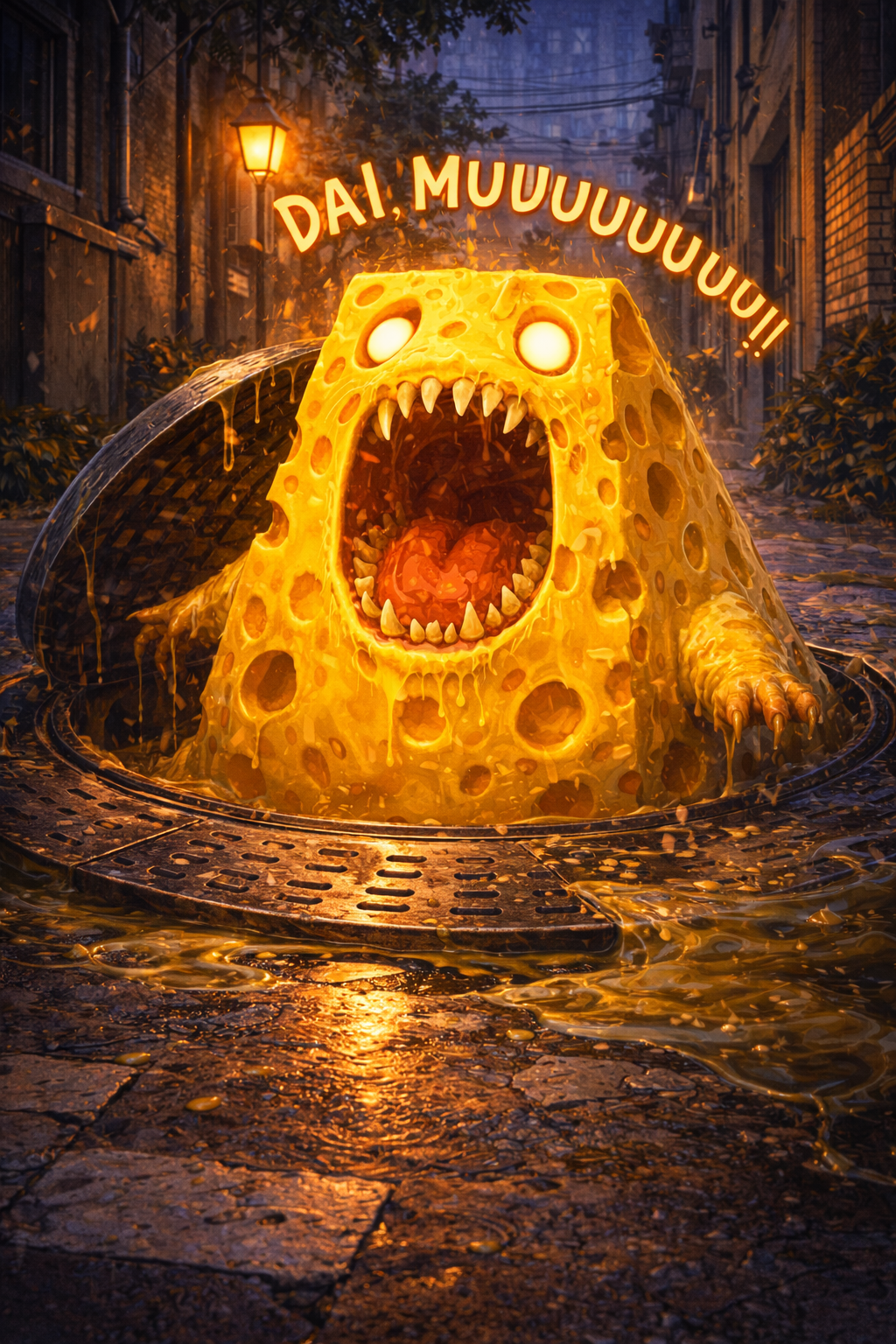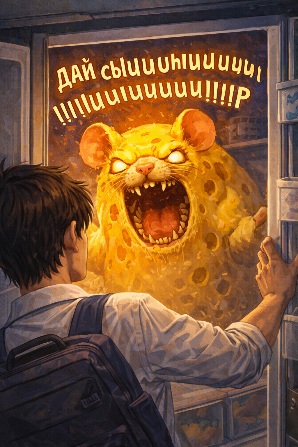 Он хотел уже спокойно дойти до дома, как вдруг из канализации выпрыгивает огромный кусок сыра и орёт: