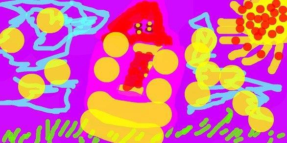 На картине Маринетт Мортем «Яркий дом, солнце и солнечные зайчики» изображен красочный и насыщенный мир, полный света и радости. Центральным элементом является ярко-фиолетовый дом с элементами цвета фуксии, который выделяется на фоне остальных объектов. Дом имеет необычную форму и декор, что делает его запоминающимся и привлекательным.