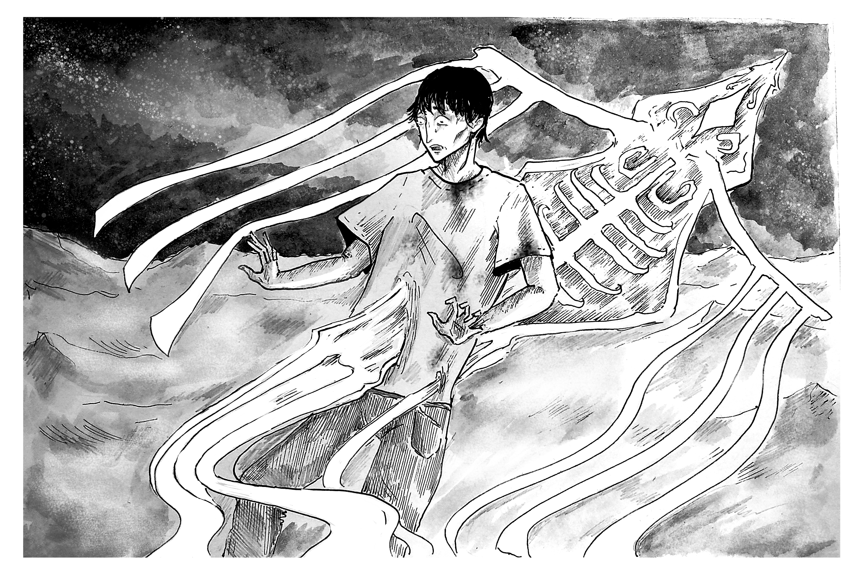 Тот самый дух, что всё это время висел рядом. Светящийся силуэт, пародия на воздушный змей. Он слегка наклонился вперёд, не имея ни мышц, ни костей.
