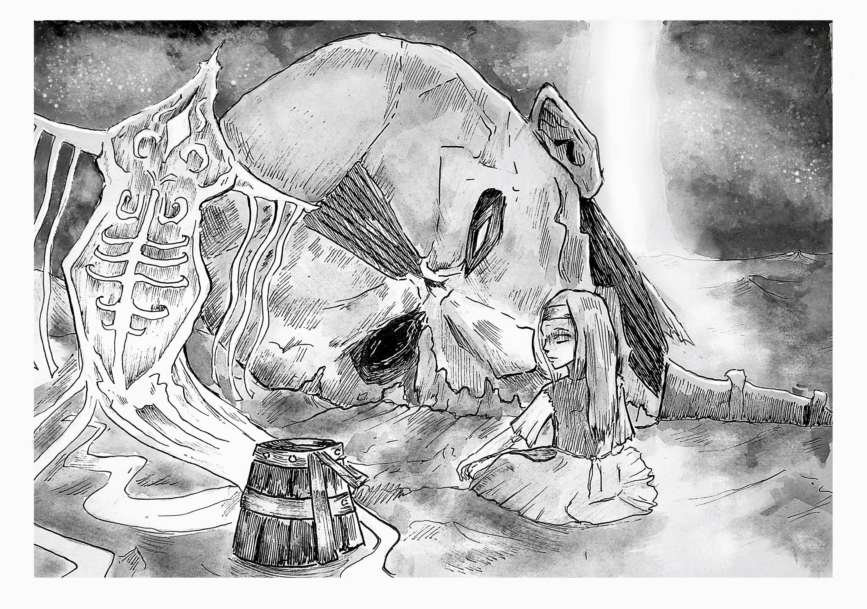 Уже сейчас над ней нависала громадная, точно выточенная из камня, голова чудовища — пугающая, почти осязаемая, с пустыми провалами глазниц, в которых отражался холодный свет чужого мира. Девочка работала неотрывно, без эмоций, словно этот ритуал был для неё единственным смыслом существования.