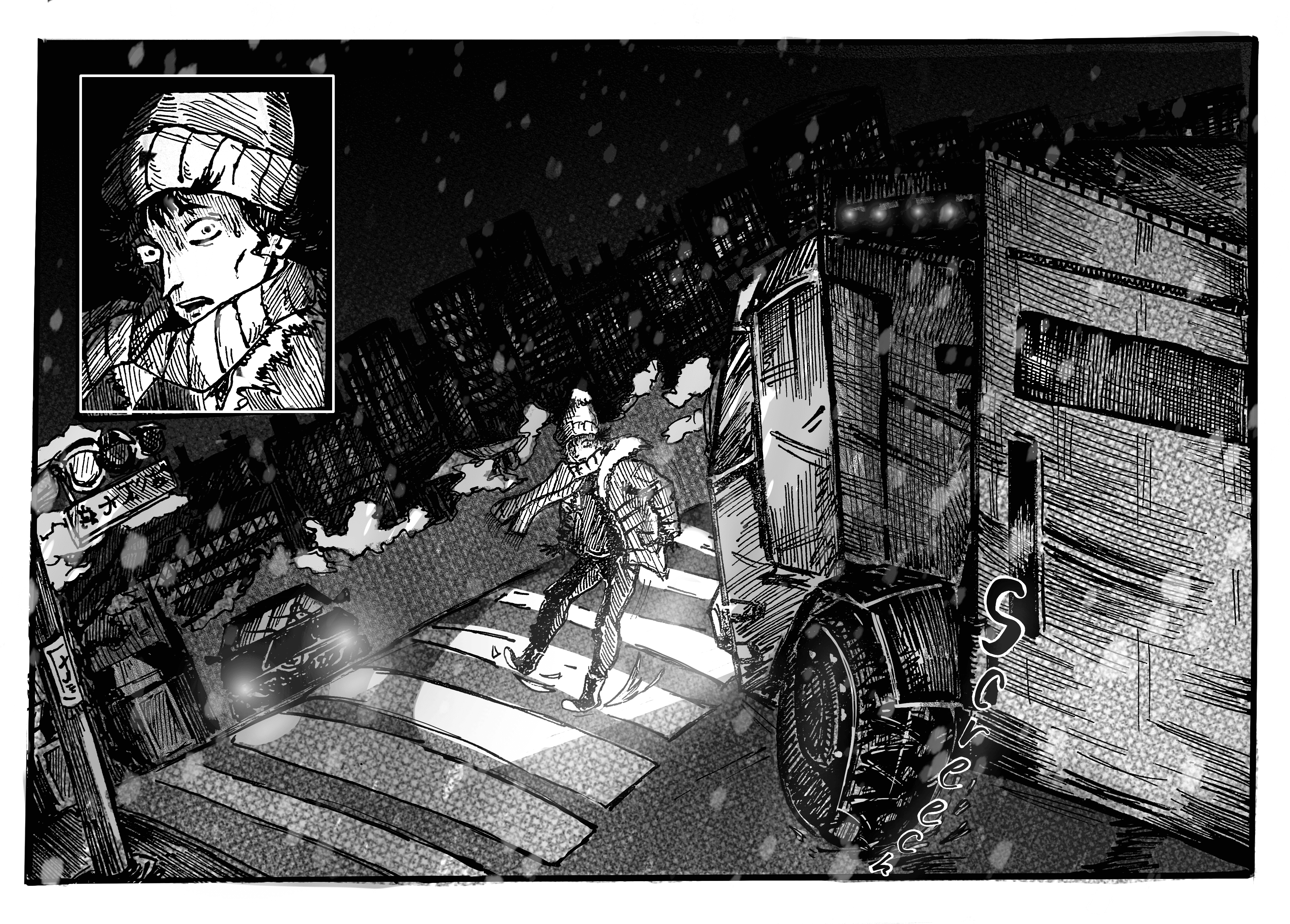 На меня несётся бл*адский КАМАЗ, мокрый кузов которого блестел в свете фонарей, колёса отчаянно скользили по наледи, водитель судорожно выворачивал руль, пытаясь уйти от столкновения, но по краям тротуара были люди, и единственной преградой для машины был только я.