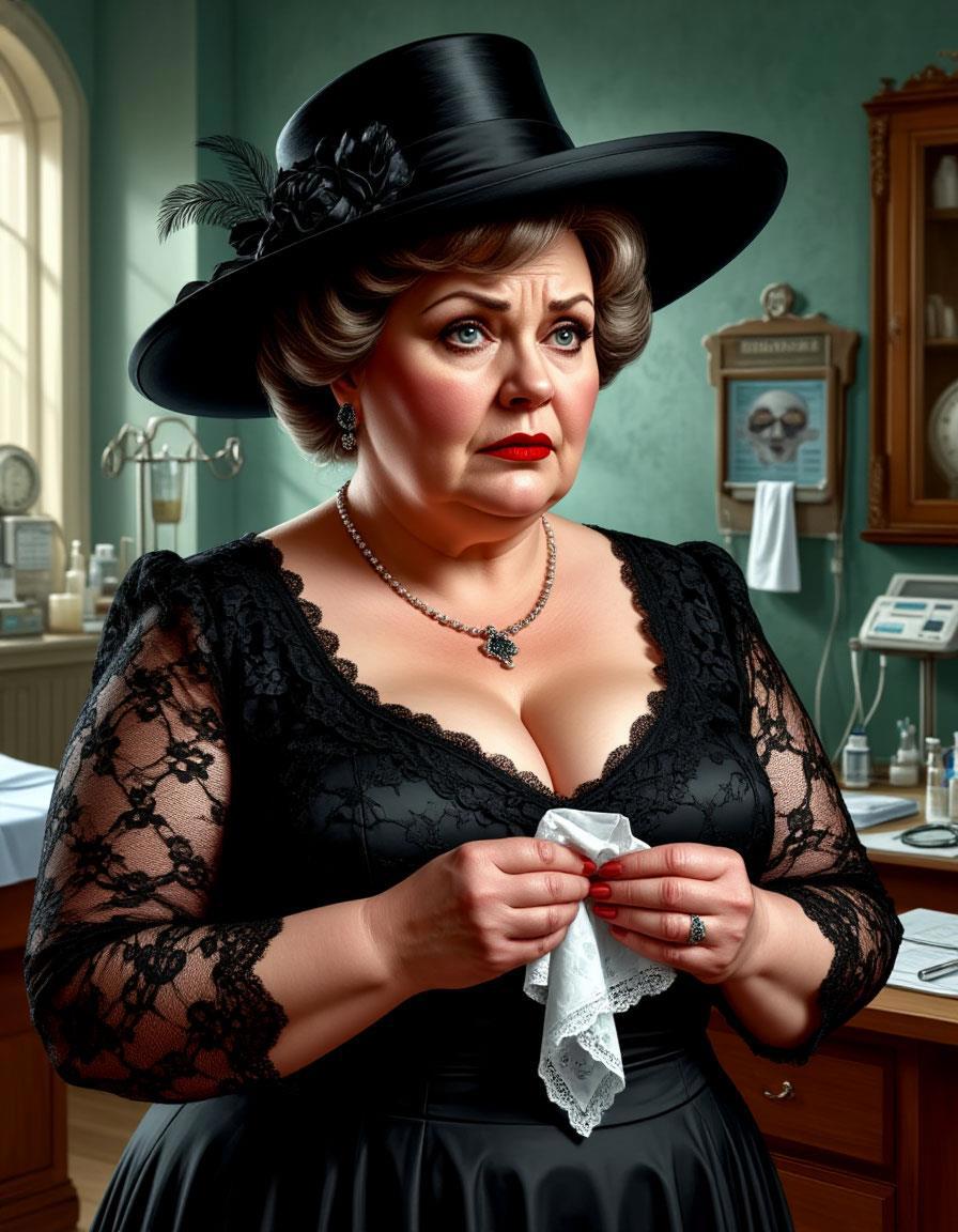 Передо мной стояла пышная дама в чёрном траурном платье и элегантной шляпке. В руках она держала кружевной, едко пахнущий духами платочек с вышивкой и непрестанно прикладывала его к глазам. Несмотря на скорбно сведенные к переносице брови и опущенные уголки губ, дама явно «вытирала» воображаемые слёзы, так как её старательно наложенный и довольно яркий макияж оставался идеальным.