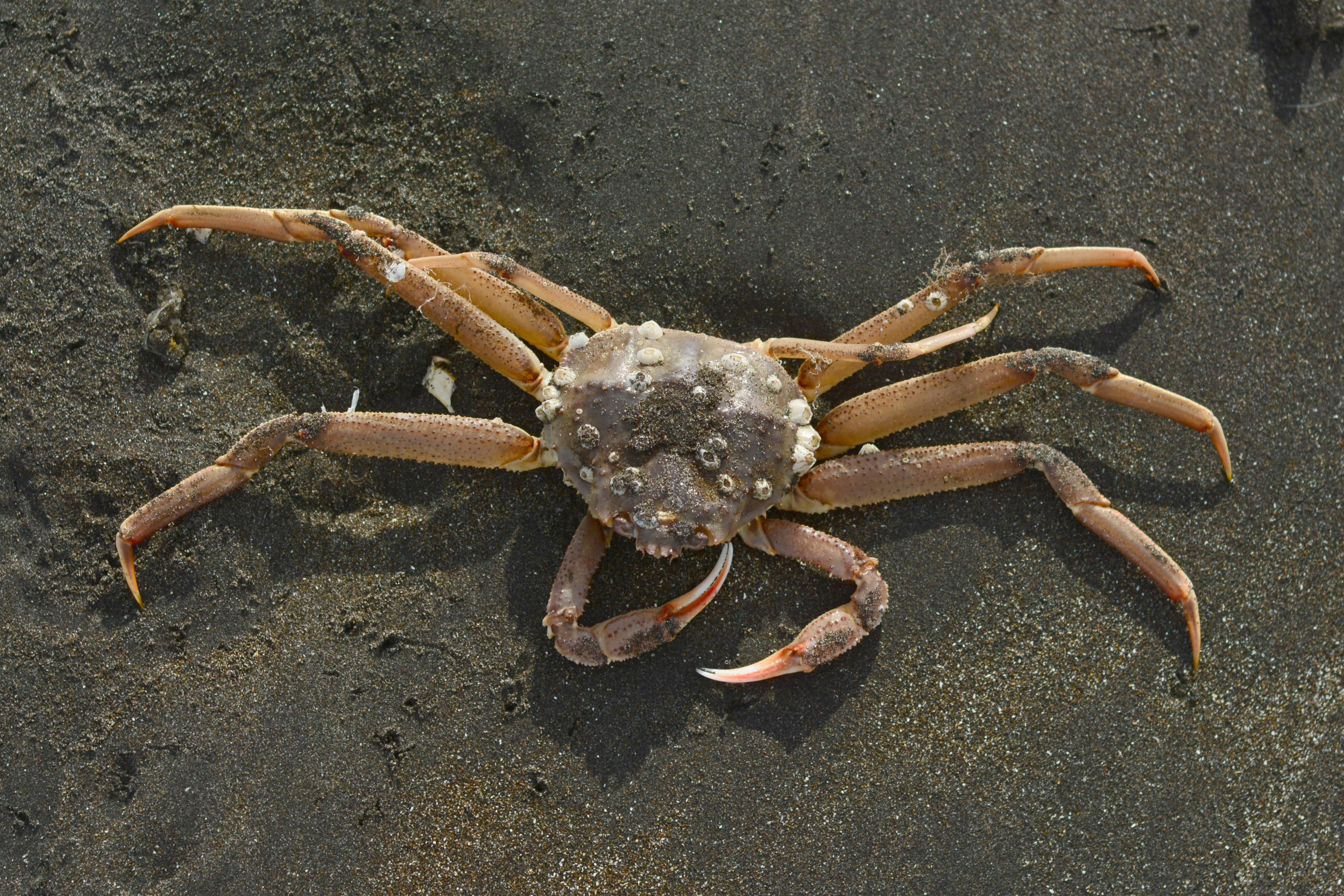 Нашелся немаленький (сантиметров 30-35 сантиметров в лапном размахе) краб. Похож на обыкновенного стригуна, но они вроде у нас не должны водиться - записал тем же родом, а там видно будет, глядишь, на "ЯНатурал" разберутся. Со стороны пуза краба уже неслабо разобрали, поэтому только приличный вид.