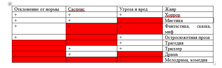 Например, отклонение от нормы без причинения вреда и саспенса – это фантастика, сказка или миф. Чтобы не перегружать текст, сделаем краткую схему, где будет понятна суть элементов: