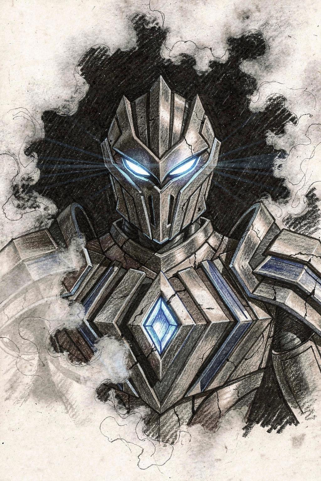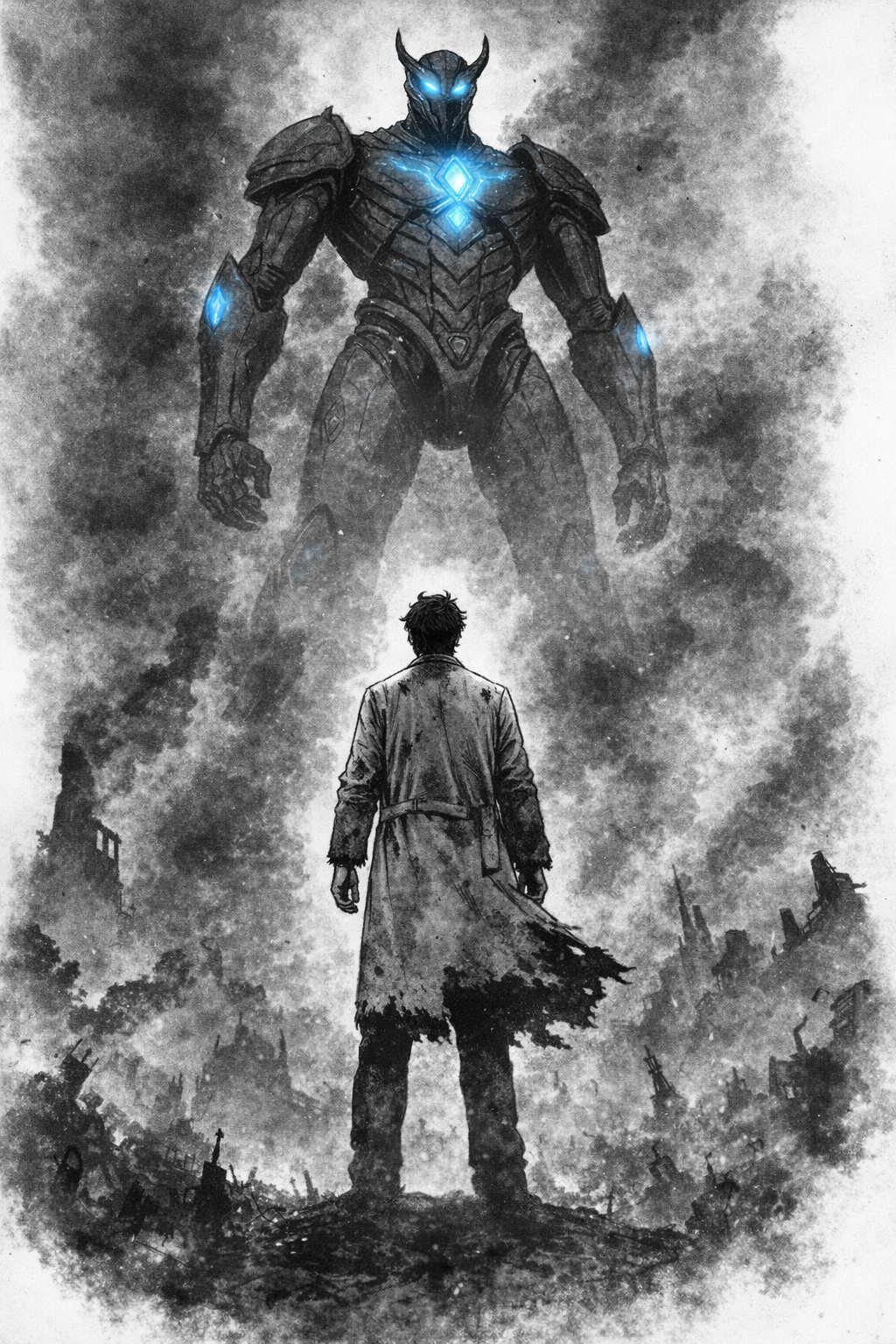 В ту же секунду коридор позади него залило мертвенно-красным светом. Из темноты вырвались беззвучные, трескучие разряды, а следом послышались тяжелые, лязгающие шаги. Это не был человек. Из проема вышла массивная гуманоидная фигура, покрытая сложной, геометрической броней из темного металла с острыми углами и резкими линиями, словно созданная из кибернетических пластин. По её корпусу пробегали пульсирующие синие светящиеся элементы, включая яркий ромбовидный кристалл в центре груди, излучающий холодное сияние.