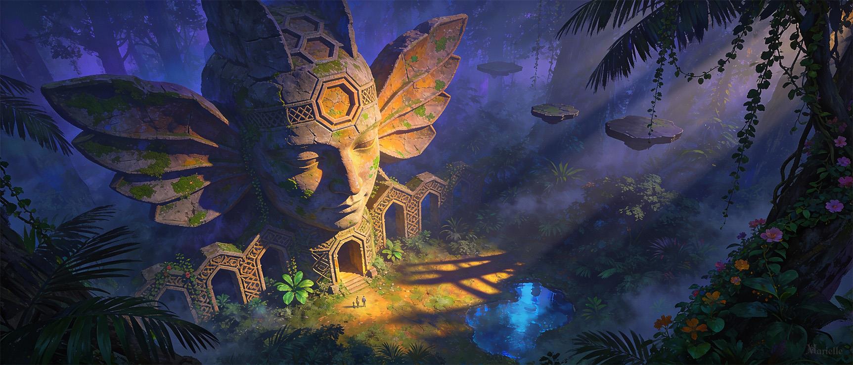 Исполинский каменный лик, высеченный неизвестными мастерами тысячелетия назад, дремал в лучах утреннего солнца, пробившимися сквозь кроны деревьев. Время оказалось удивительно милосердно к статуе: мох и небольшие трещины лишь подчеркнули совершенство каменных изгибов.