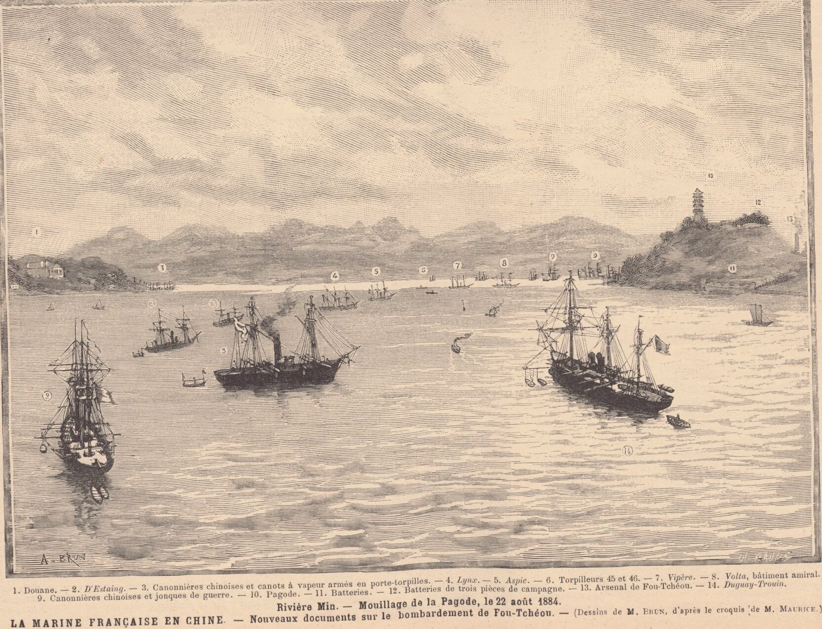 Премьер-старшина знал, что говорил. Он прослужил минёром почти двадцать лет, и из них три последних - на минных катерах. Он и сегодня состоял командиром миноноски №45, небольшого судёнышка с железным корпусом и водоизмещением в тридцать тонн, вооружённого «лонжеронными торпедами» – так во французском флоте именовали шестовые мины. Кроме «сорок пятой», в состав эскадры адмирала Курбэ, что разворачивалась сейчас на рейде Ма Вэй, образованном слиянием рукавов реки Мин ниже города Фучжоу, входили ещё три носителя этого оружия – железная сорокатонная миноноска №46 и два малых паровых катера, позаимствованных с крейсеров «Вийяр» и «д'Эстен». На самом деле, таких «внештатных» боевых единиц могло быть три, но один из катеров, приписанный к крейсеру «Вольта», полгода назад отбыл вместе с крейсером во Францию – к большому сожалению премьер-старшины, чей приятель как раз этим катером и командовал. Всего же во французском отряде, явившемся к Фучжоу, числились четыре бронированных крейсера, один безбронный и три канонерские лодки. Даже без учёта прибывшего накануне на усиление броненосного "Триомфана" (прочие крупные корабли не смогли преодолеть отмели в устье реки) французы превосходили Фуцзянский флот по водоизмещению вдвое, а по весу минутного залпа – так и вдесятеро.