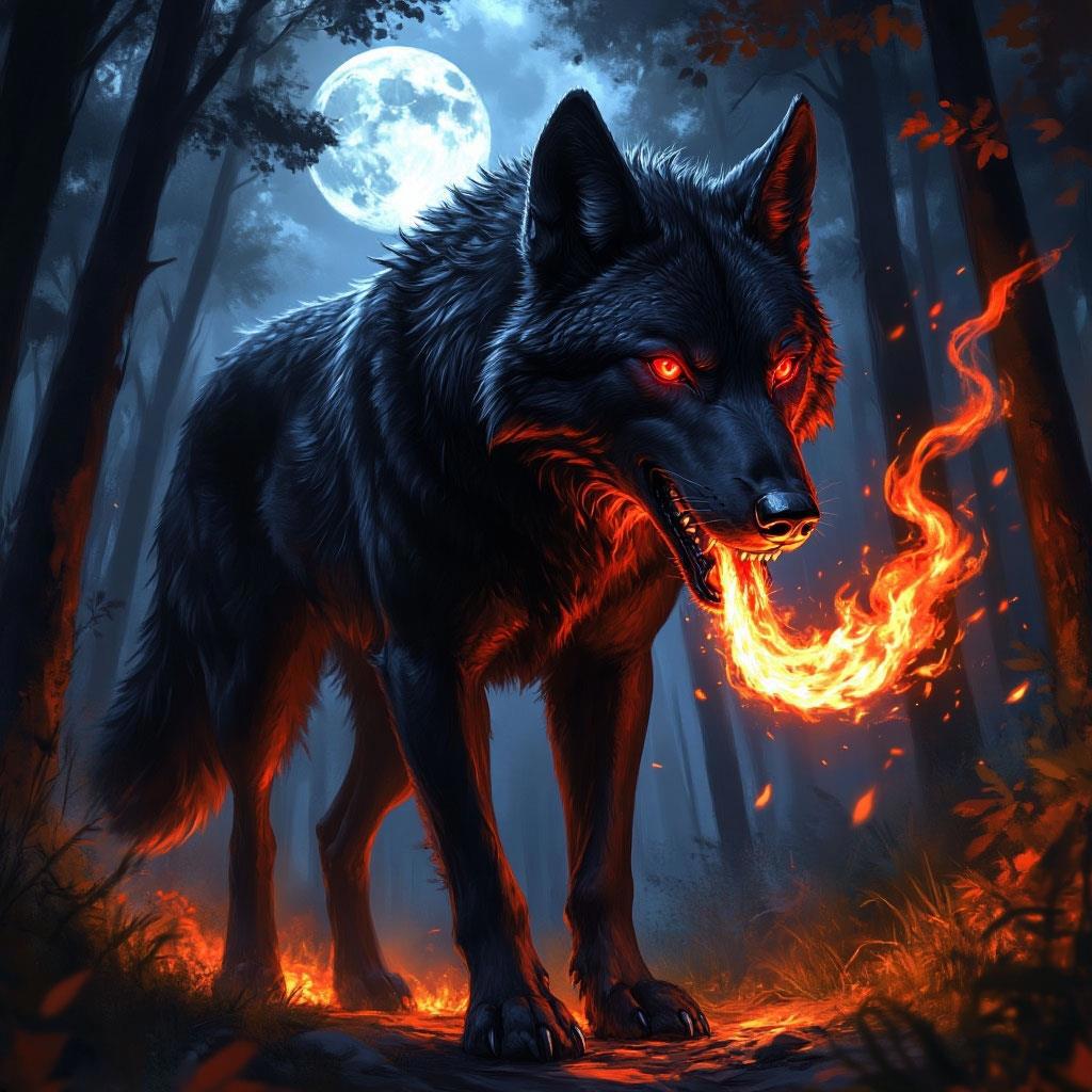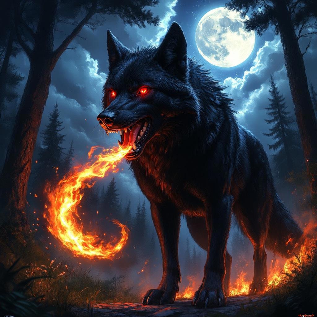 Внешний вид. Огромная черная собака с красными глазами и языками пламени из пасти.