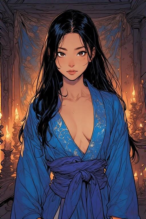 Их было трое. Не те хрупкие, загадочные статуэтки из рассказов, а женщины смертельной, знойной грации. Одежды… одежды почти не было. Тончайшие шелка цвета рассветной зари, кровавого рубина и глубокой ночи лишь намекали на формы, подчеркивая, а не скрывая. Высокие, сложные прически, белила и румяна на лицах, превращавшие их в живые фарфоровые маски с огромными, подведенными черным глазами. Они не просто шли — они плыли под странную, гипнотическую музыку: дребезжащий звук цимбал, томный напев флейты и глухой, ритмичный стук барабана, бивший прямо в живот.