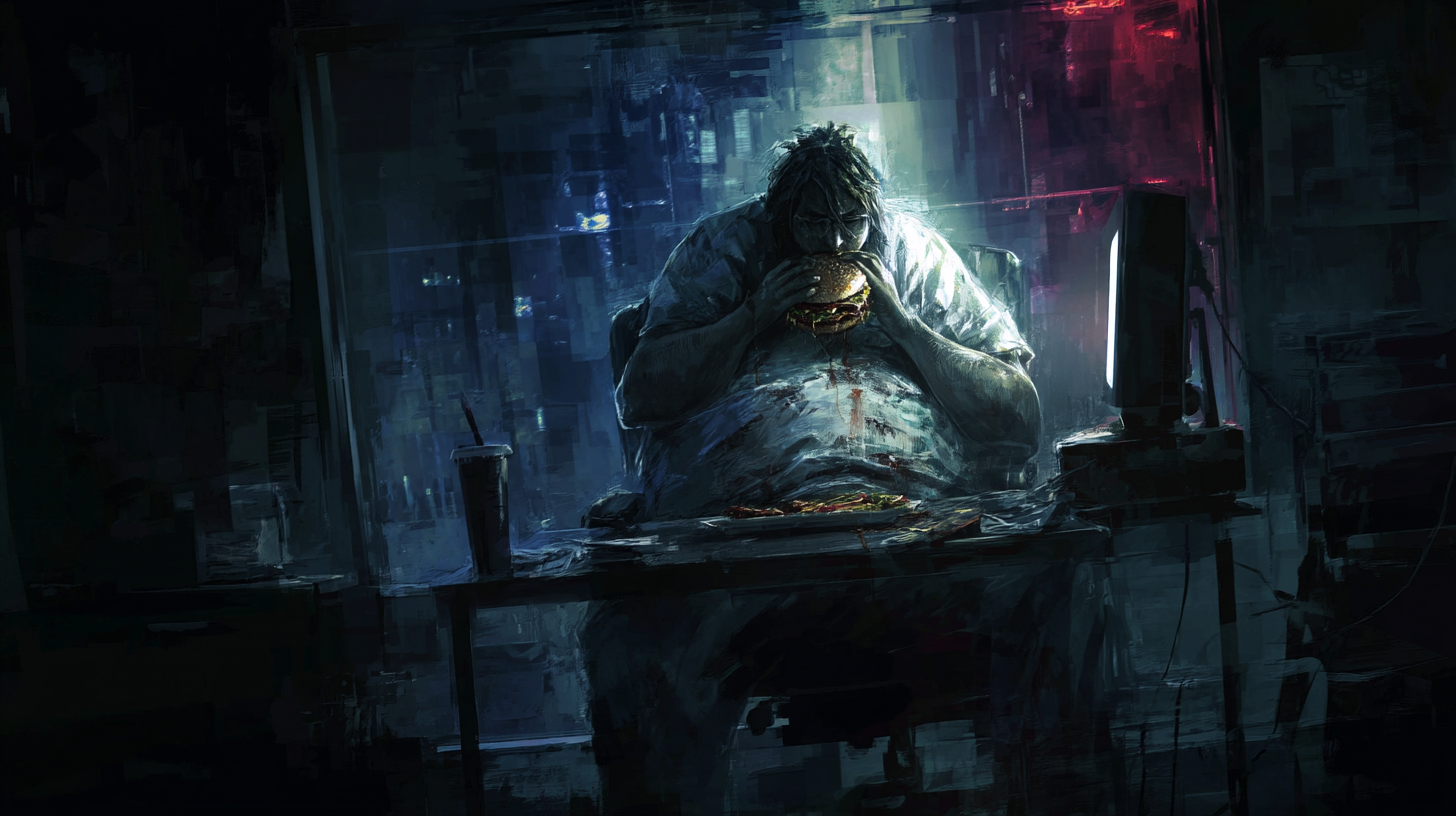 Крайне упитанный врач, весом не менее ста двадцати килограммов, с развивающимся пороком сердца вышел из дежурного отделения морга с жирным гамбургером в руке.