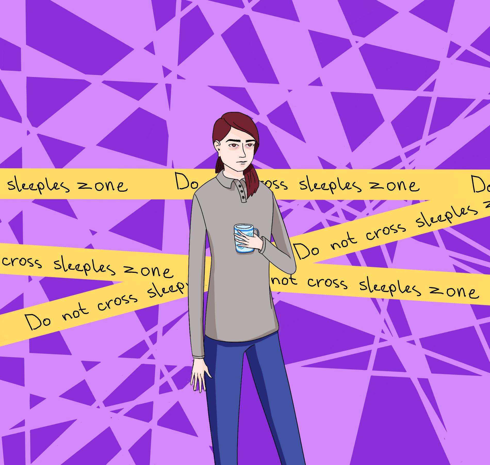 Она стоит, опустив одну руку вниз, а в другой держит кружку с кофе. За ней находится фиолетовая зона, разделённая на светлые и тёмные треугольники как будто бы невидимыми линиями. Эта зона обозначена предупреждающими желтыми лентами - скрещенными линиями, которые указывают на то, что это огороженное место - зона снов. Девушка как будто находится между двумя мирами — реальностью и сном, либо является или часовым или патрульным .
