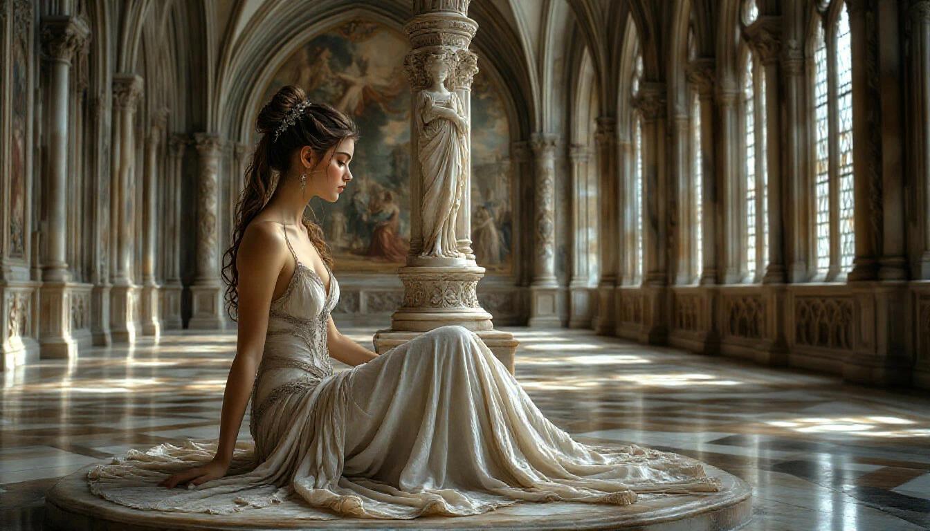 Вот уже более четверти часа эта юная особа оставалась совершенно неподвижной, так что со стороны могло показаться что она не живое человеческое существо, а каменное изваяние прекрасной незнакомки, сотворённое великим скульптором, который водрузил его здесь в этом пустом зале в назидание грядущим поколениям как непререкаемое напоминание о вечной юности и неувядающей красоте.