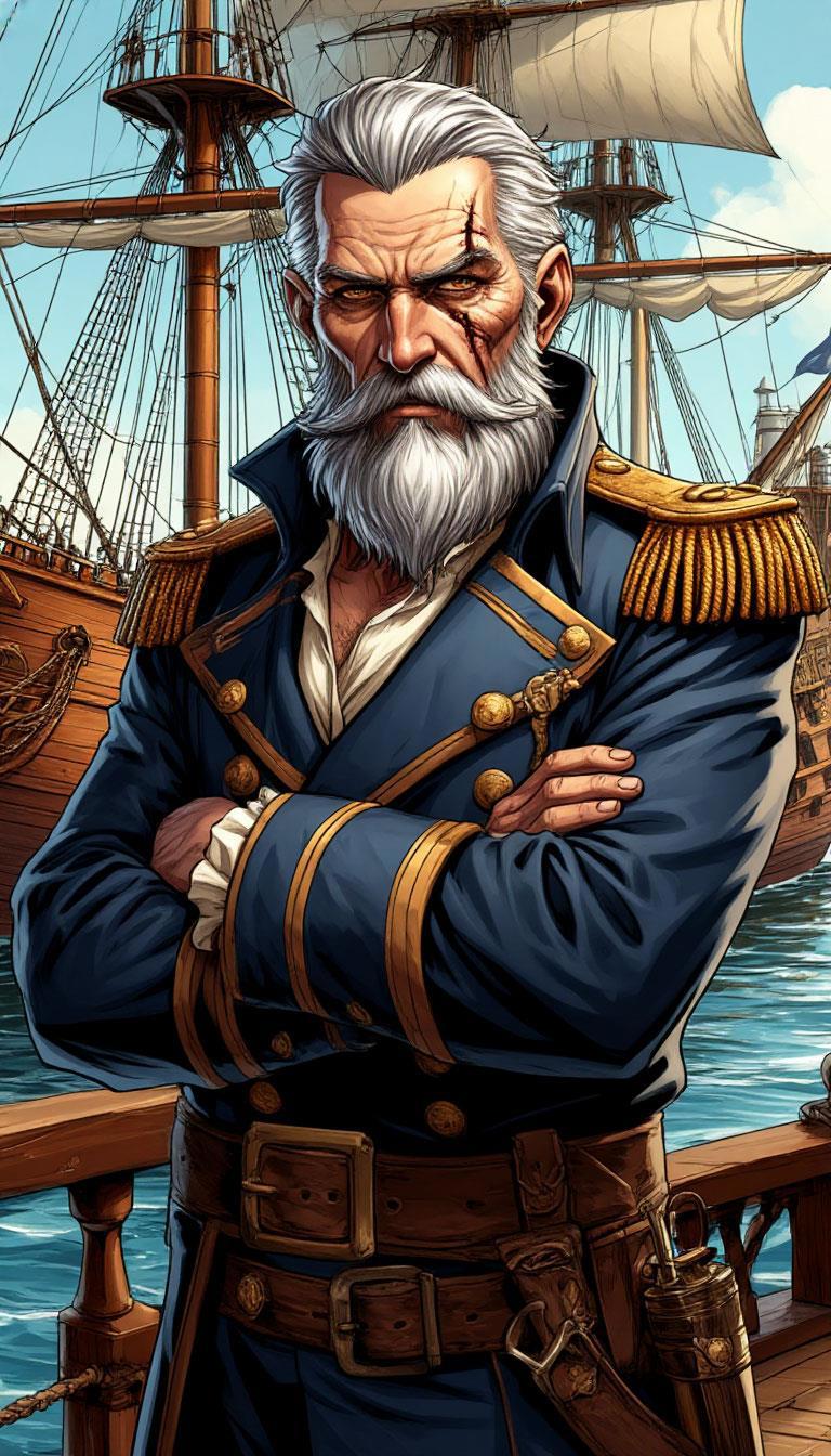 Капитан «Морского Пегаса» — адмирал Фрай Герх, старый морской волк, прошедший все моря и океаны. Мужчина в возрасте. Лицо в морщинах, на левой стороне шрам, говорящий о жизненном опыте и о прошлых битвах. Выражение на лице серьезное и даже суровое. Взгляд прямой и проницательный, выражающий сильный характер и решительность. Короткие, седые волосы зачесаны назад. Эта причёска придает адмиралу вид дисциплинированного и опытного человека. Длинная, ухоженная седая борода завершает образ, добавляя ему мудрости и солидности.
