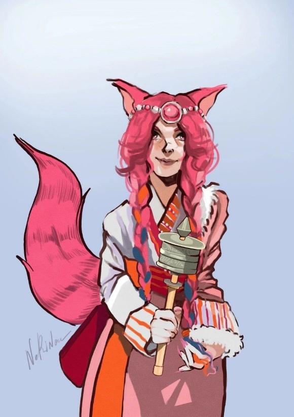 Описание (дано автором): Маленькая персиковая лисичка. Дерзкая и игривая. Лисица-кицуне. Была при жизни обычной девушкой, живущей в японии, но после смерти осталась на земле в воплощении духа лисы. После смерти ей приписано было помогать людям и стать жрицей храма, который находится в горах. Храм не пользуется особой популярностью, потому что вокруг места ходят слухи о духах (коими и являются жрицы), однако те, кто осмелился туда прийти и попросить о самом сокровенном — обязательно получают желаемое. Очень задорная и веселая.