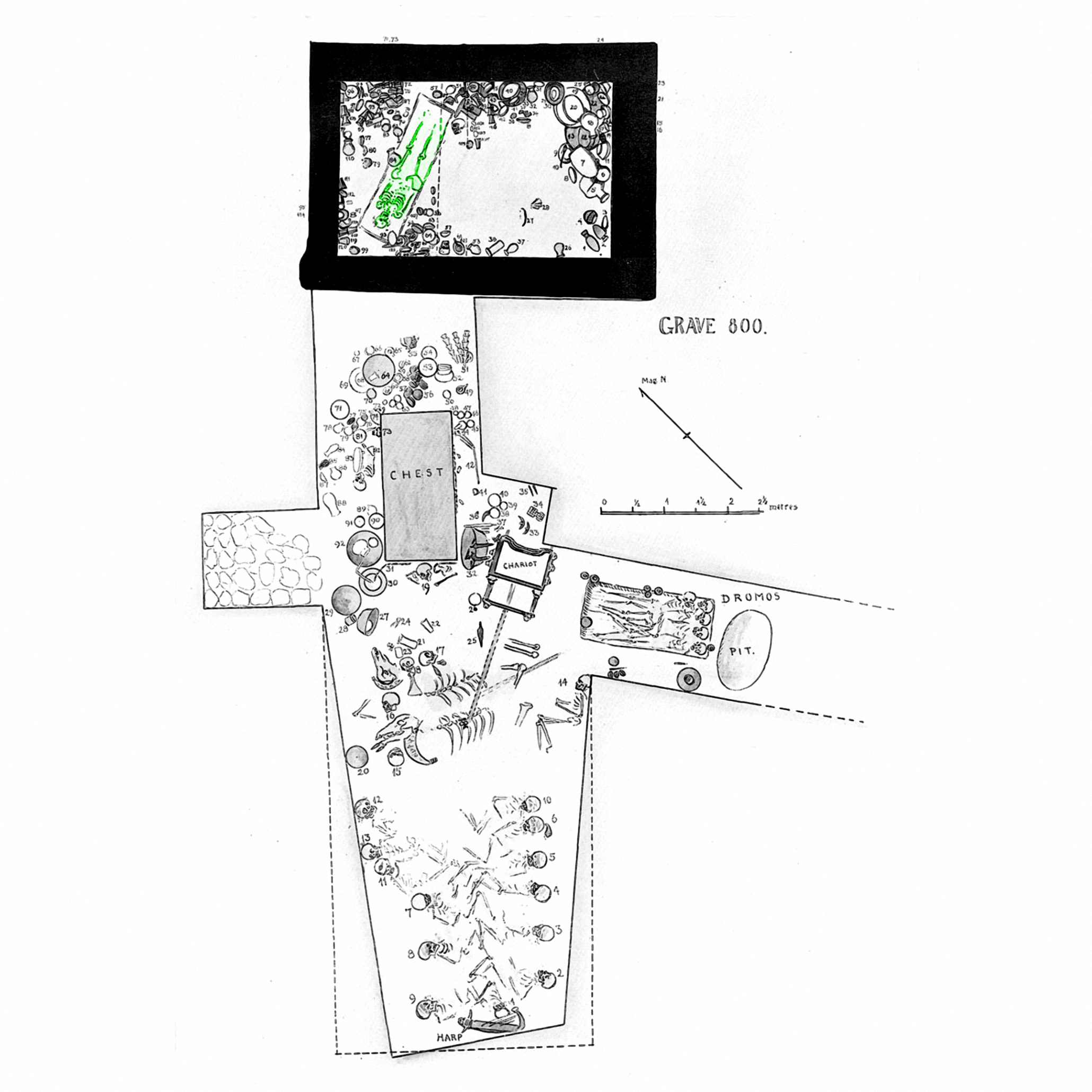 Схема погребальной ямы PG800 и камеры PG800B с телом Пуаби (Вулли, 1934, раскопки в Уре, том 2).