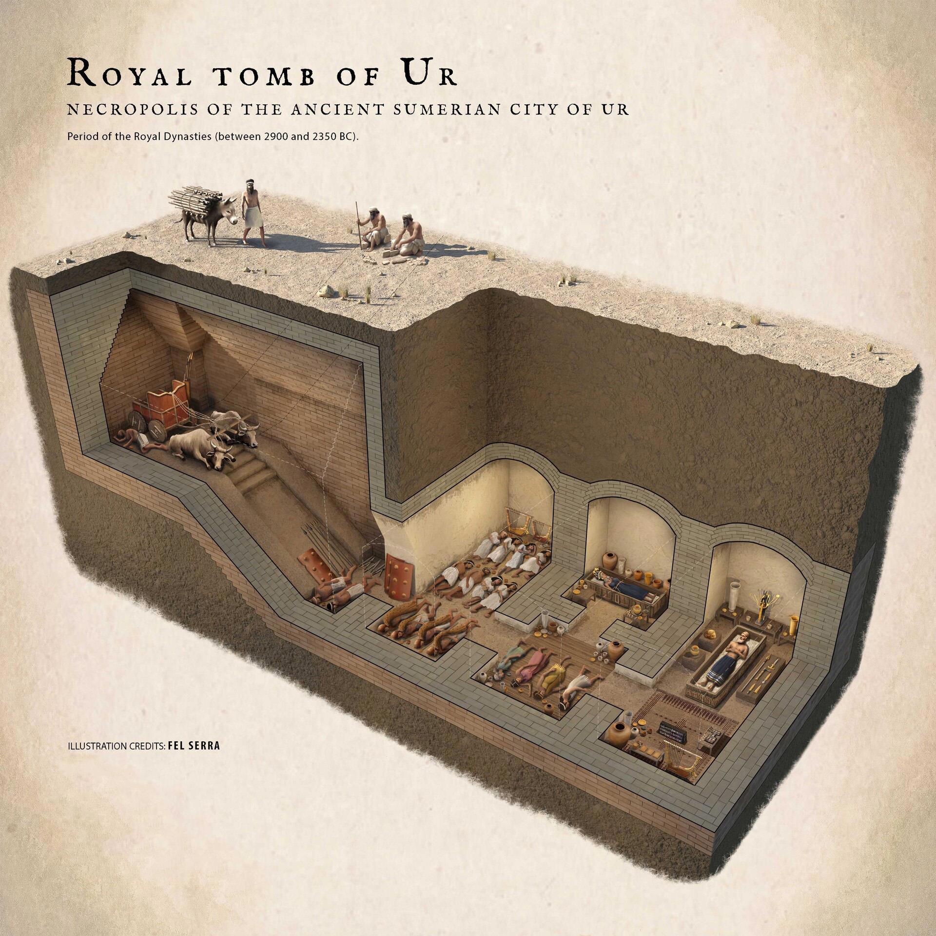 Сегодня нам кажется очевидным, что нельзя брать с собой за грань жизни такие «сокровища», как человеческие жизни. Однако элита шумерского Ура придерживалась иного мнения. Им были нужны роскошные подношения — украшения, косметика, продукты питания, дорогое оружие, — которые сопровождали бы их в Подземный мир богини Эрешкигаль. Служанки, солдаты, возничие, животные, а также певцы и музыканты должны были служить своим господам после смерти так же, как и при жизни.