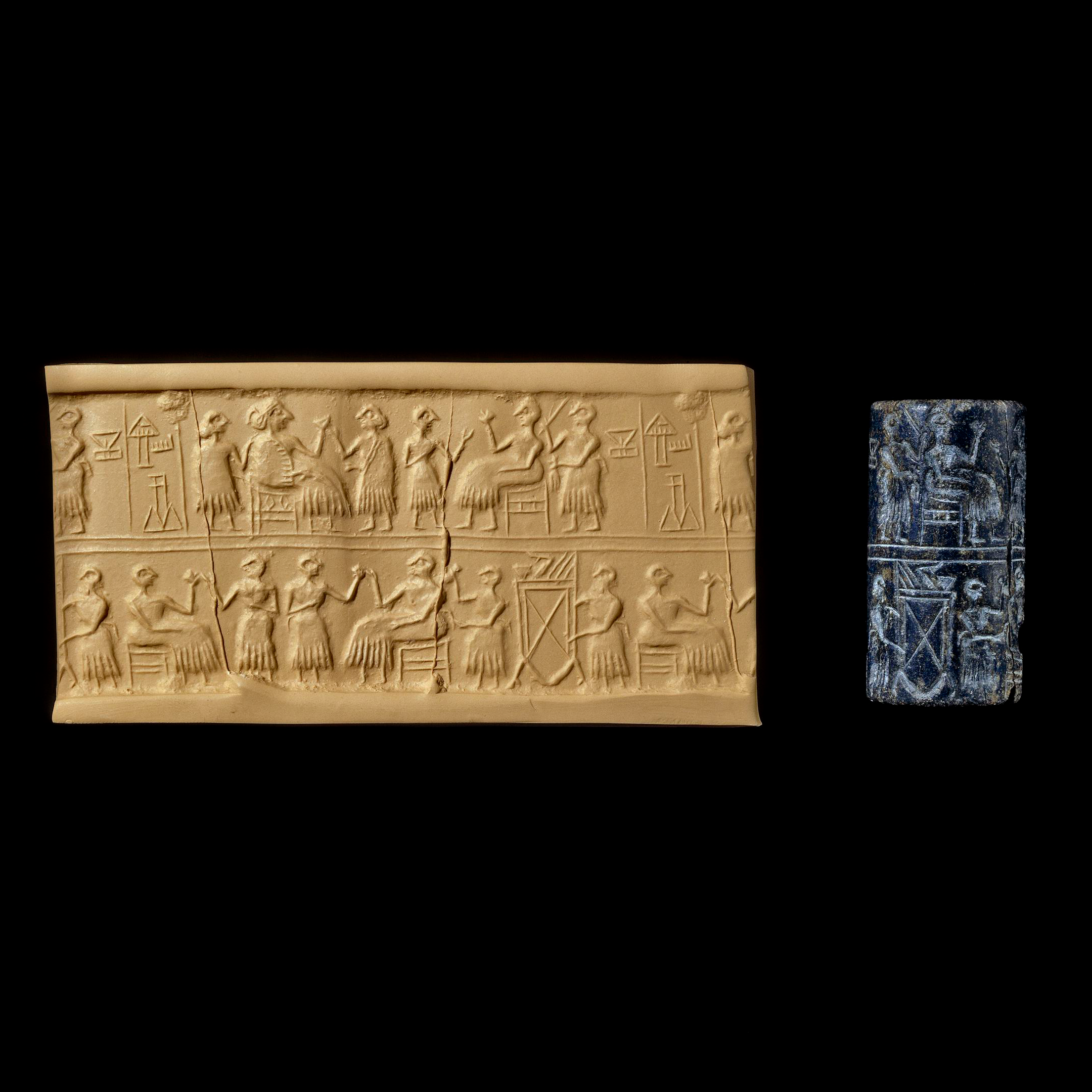 Печать Пуаби, Ближний Восток, Южный Ирак, Царские гробницы Ура, гробница PG 800. Древний Шумер, Раннединастический период IIIа , 2600-2400 год до н.э. Лазурит, диаметр 2,60 см, высота 4,90 см. Британский музей, Лондон, №121544. Найдена на правой руке Пуаби, которая лежала, распростертая на спине, на носилках.