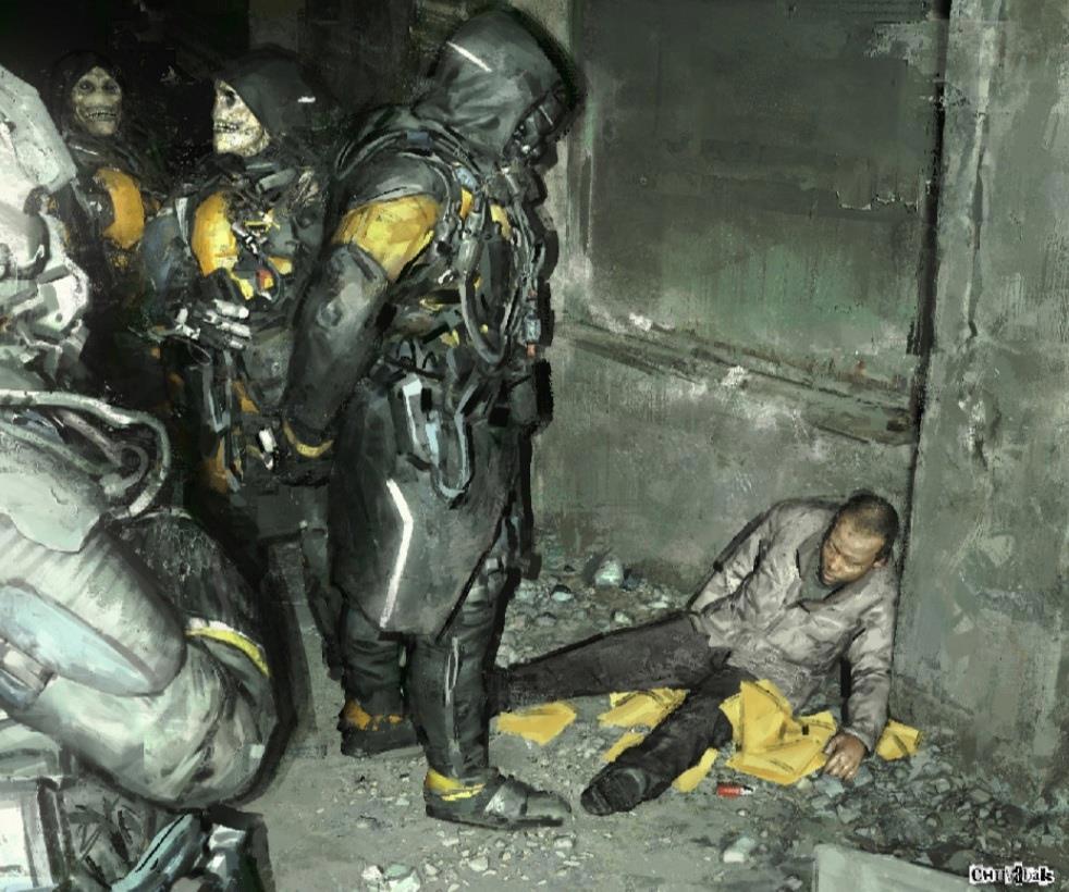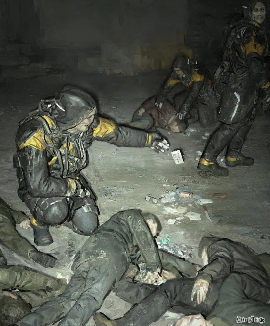Фигура в черном костюме присела около горы трупов. Он внимательно осмотрел тела. Принюхался. Его чёрные глаза казалось хотели выхватить каждую деталь. Он пошарил по карманам мертвецов, но не нашёл ничего полезного. Такая же участь ждала и его товарищей. Небольшая горка ненужного мусора копилась слегка поодаль.