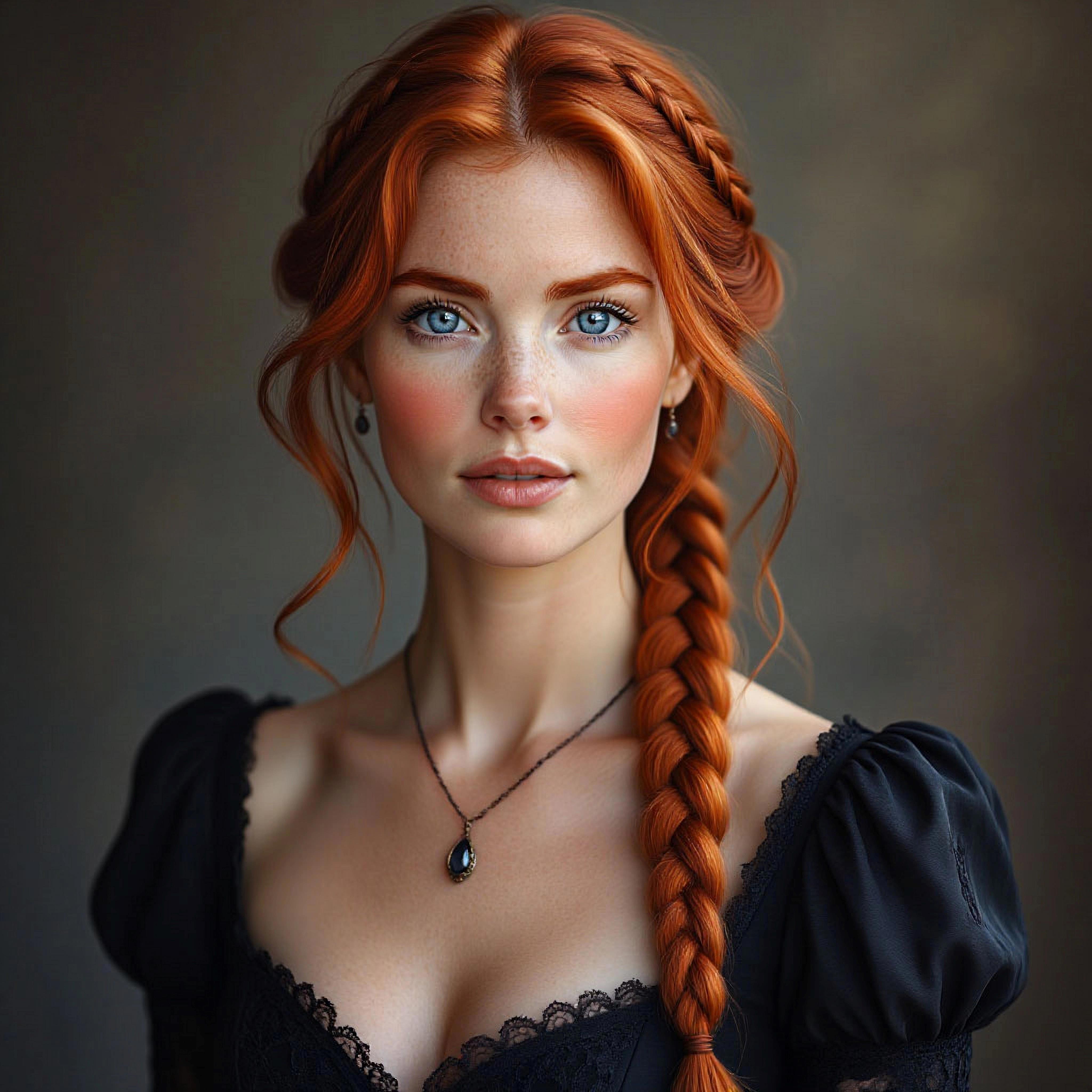 Рыжие волосы, некогда вызывающе яркие, теперь были заплетены в две тяжёлые косы, обёрнутые вокруг головы, словно венец. Лицо, с правильными скулами, заострившееся с годами, хранило след былой красоты — не броской, но благородной. Глаза — ярко-голубые, как весеннее небо над Темзой, — стали потускневшими, будто уставшими видеть слишком многое. В их глубине обитала постоянная, тихая боль, сдерживаемая английской выдержкой.