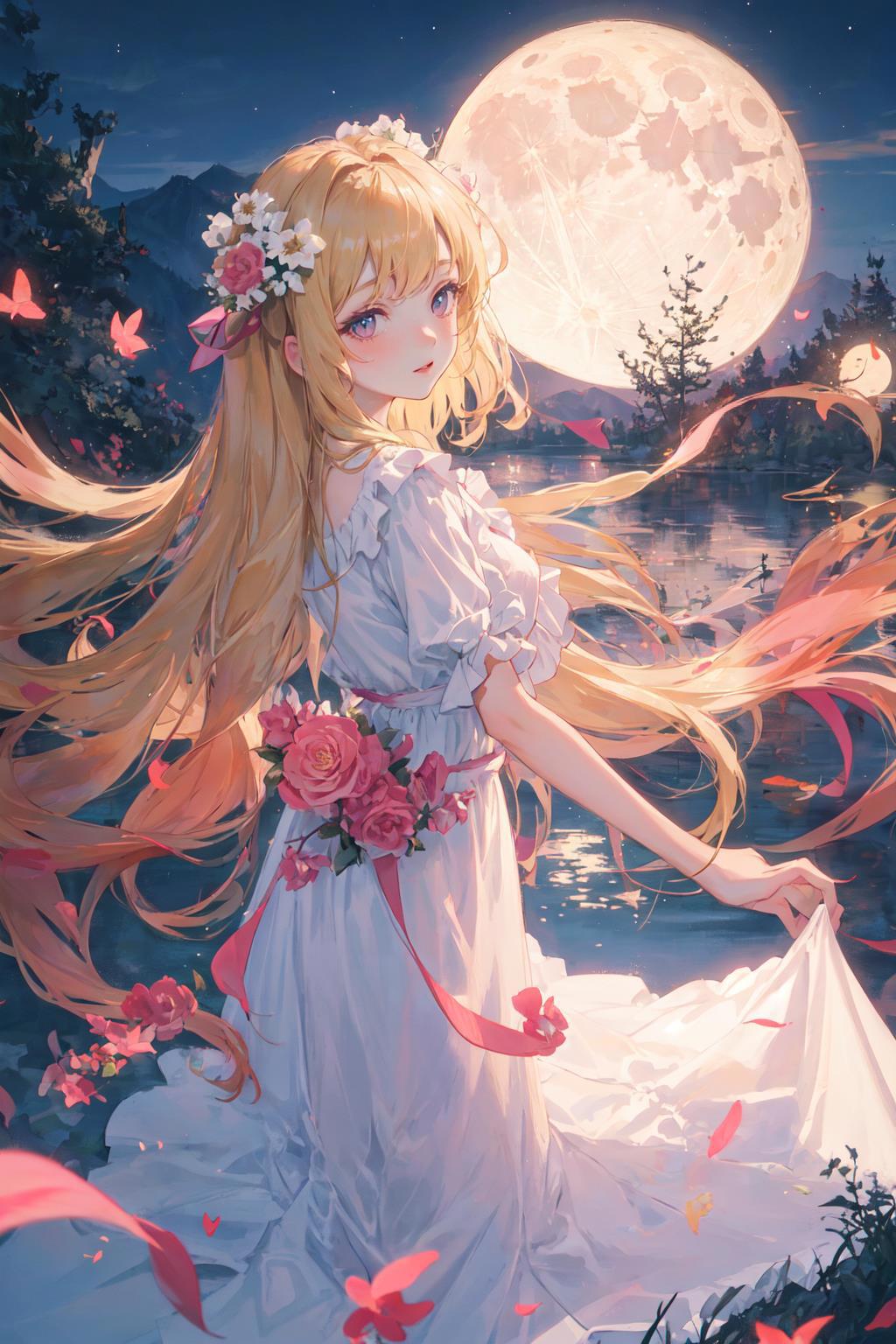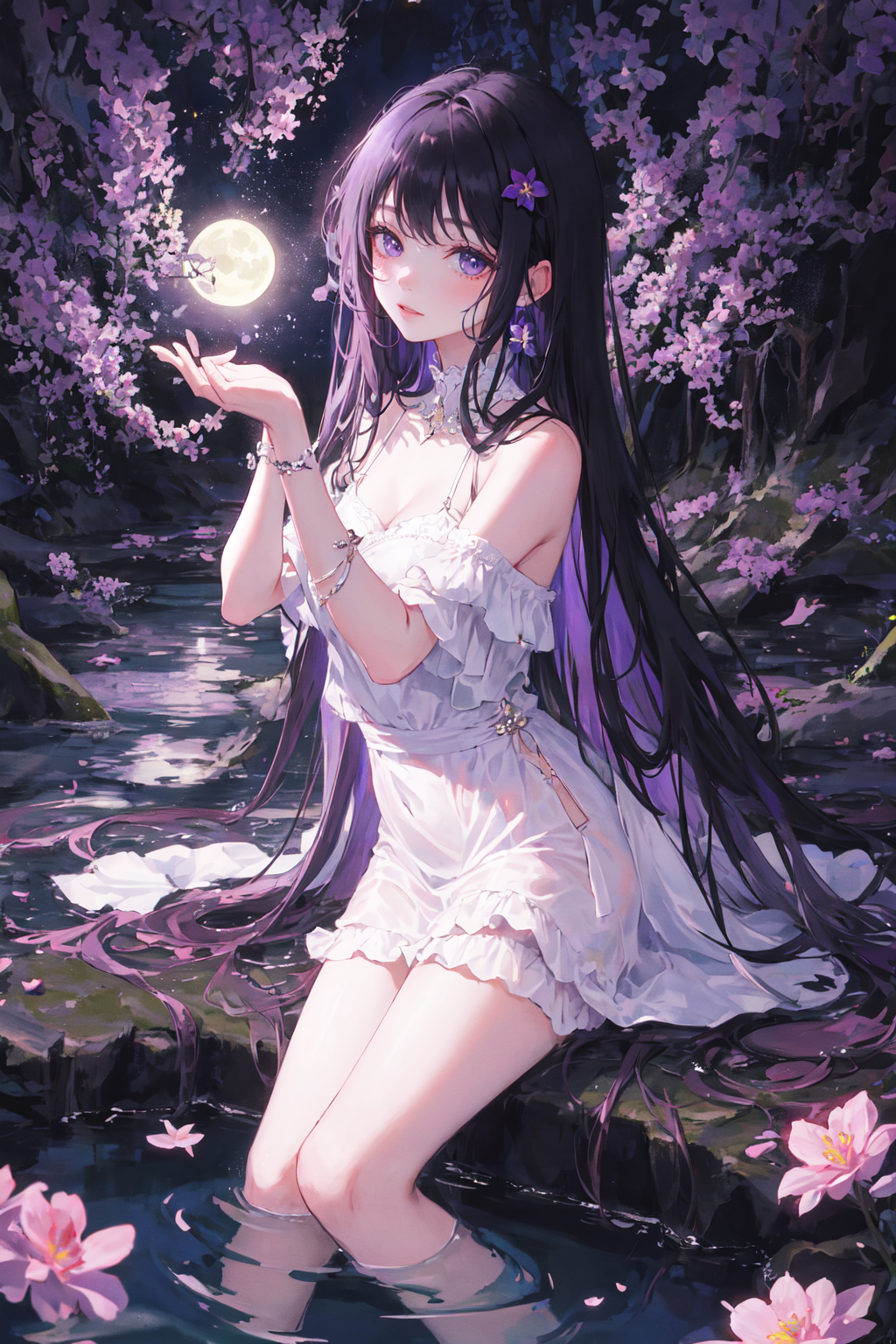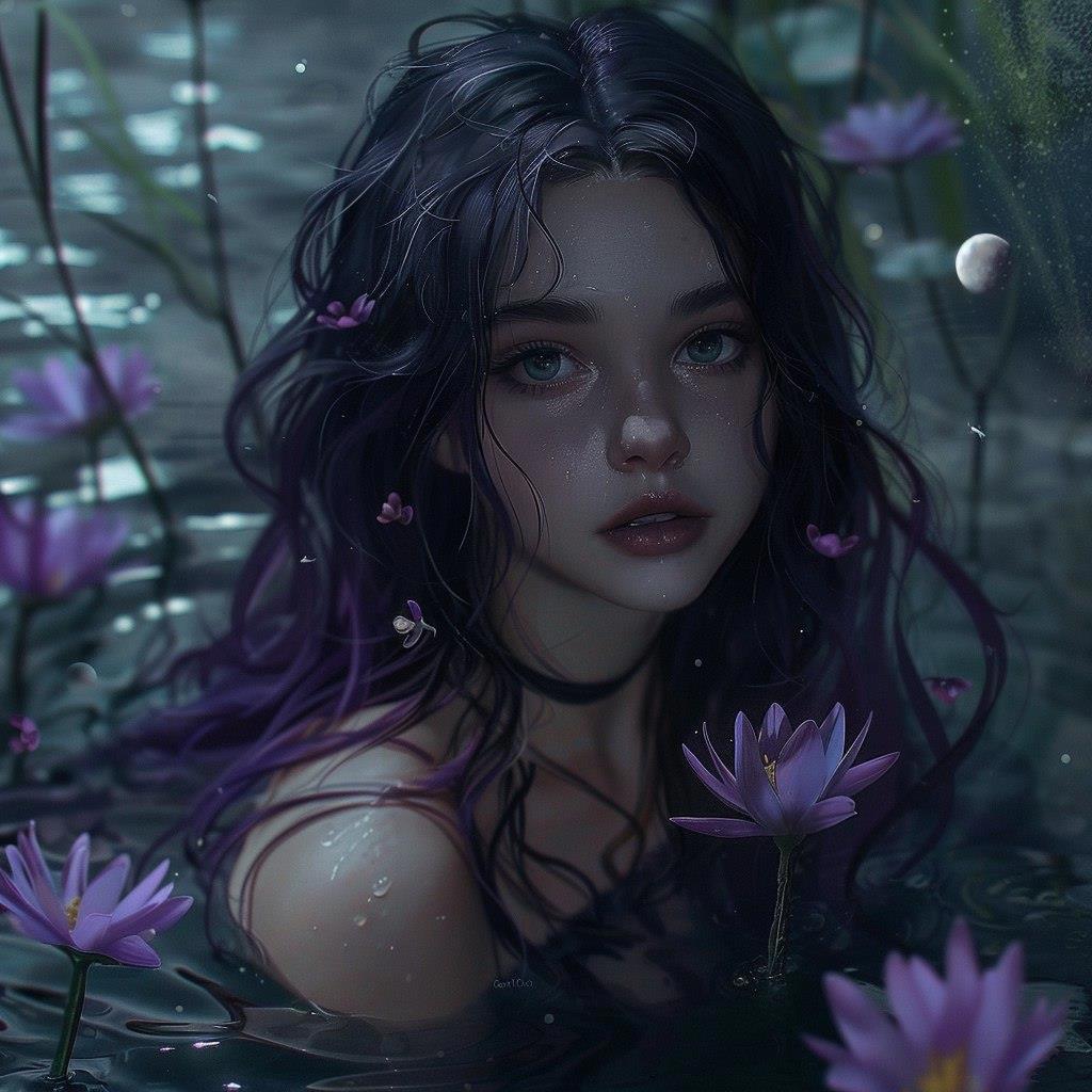 Девушка стоит по колено в прохладной воде озера, наслаждаясь трещанием цикад и шумом ветра. Силуэт её подсвечивает свет полумесяца, что визуально делает изначально бледную кожу фарфоровой. Дева поднимает руки к небу, собирая энергию луны на своих ладонях и дальше пропуская по кровеносным сосудам. Всё тело принимает лунный свет и наслаждается им.