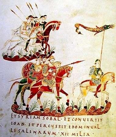 В Золотой Псалтыри, ок 900 г, есть миниатюра, изображающая войско каролингской эпохи в походе. Впереди – драконарий со знаменем-"драконом".