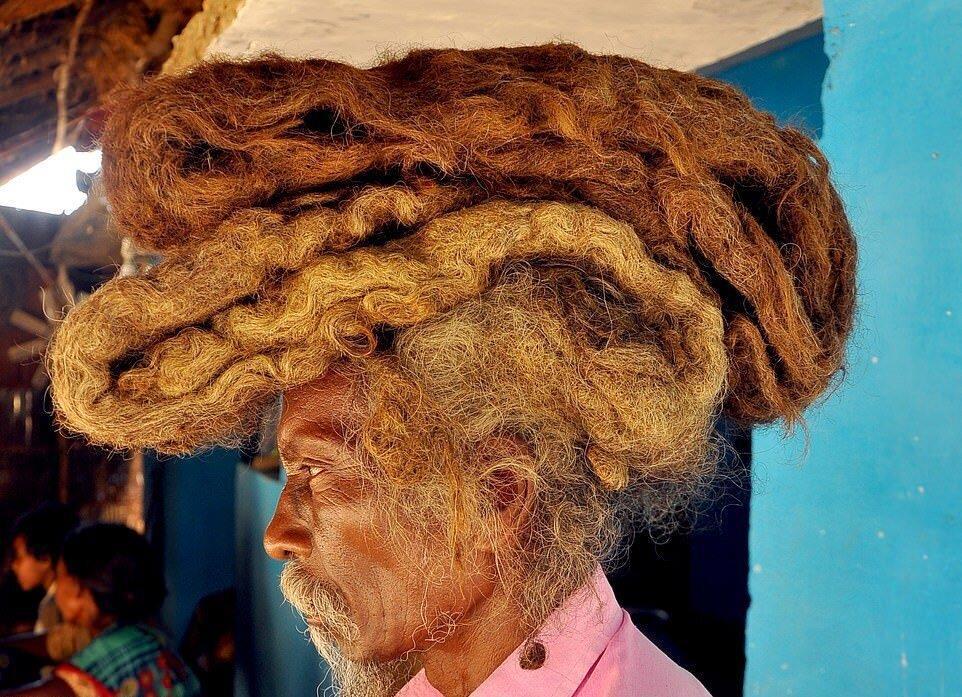 Частенько за волосами вообще не предполагалось ухаживать. Их не только не расчесывали, но еще и не мыли — по крайней мере первые 3-6 месяцев. Потом-то мыть было можно, волосы уже не расплетались. Слышали про дреды? Так вот — это древнейшая, известная людям прическа. Вот как ниже — этот мужчина из Индии 40 лет не расчесывал и не стриг своих волос. Его считают святым.
