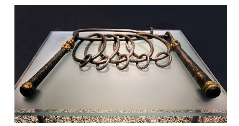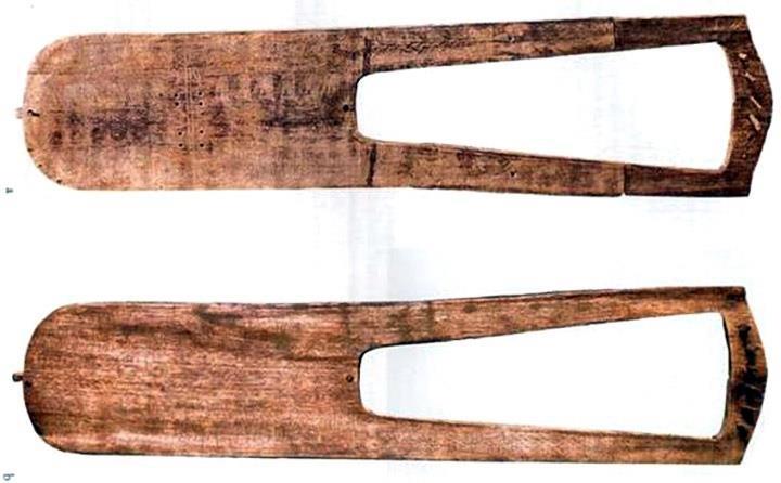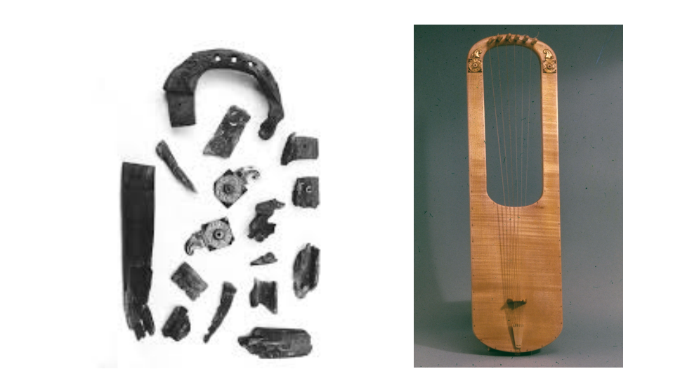 На фото ниже представлены фрагменты лиры Sutton Hoo lyre (слева), обнаруженные археологами (фото из Британского музея в Лондоне). Справа — современная реплика (фото из Furman University, Greenville).