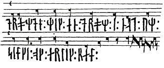 Однако известен пример, когда руны использовались для нотной записи (примерно в 1300 году). Существует уже упомянутый мной источник — Codex Runicus, написанный средневековым футарком, где каждой руне соответствует буква латинского алфавита. Этот документ в основном касается датского сканского права (Skånske lov) и ранней истории Дании. Но интересно, что последний лист этой рукописи содержит стих с нотами (об этом я уже писала в разделе «ПЕСНИ»).