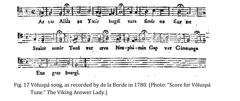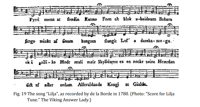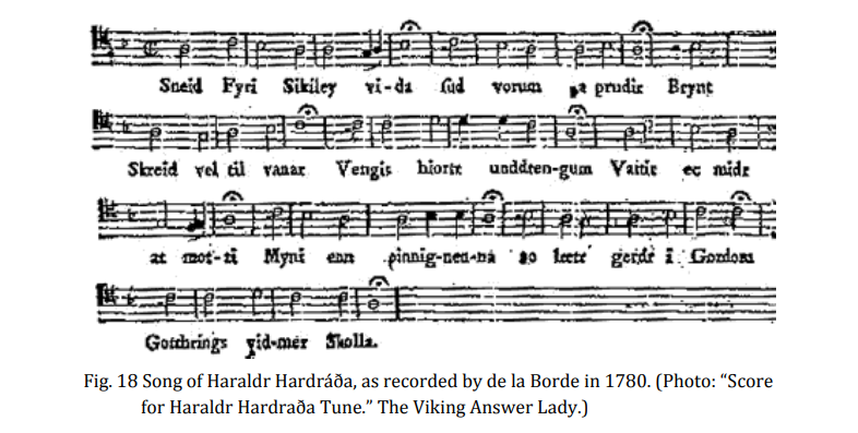 Понятно, что историки хватаются за любые современные традиции, которые могут быть связаны с далеким прошлым. Поскольку Исландия долгое время находилась далеко от материкового европейского влияния и сохранила самую тесную лингвистическую связь с древнескандинавским языком (современные исландцы могут чить оригиналы саг без "перевода"), естественно снова обратиться к Исландии. Здесь нам помогут пять древнескандинавских текстов, зафиксированных в 1780 г. в книге Жана-Батиста де ла Борда (Jean-Baptiste de la Borde) под названием «Essai sur la Musique Ancienne et Moderne».