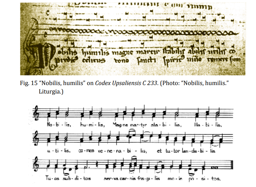 Ранняя мелодия, называемая «Nobilis, humilis», сохранилась в манускрипте конца 13 в. Codex C 233, Уппсала, Швеция. Это своего рода гимн святому Магнусу, состоящий из семи строф, написанный для двух голосов. Можно предположить, что она отражает черты раннесредневекового скандинавского стиля.