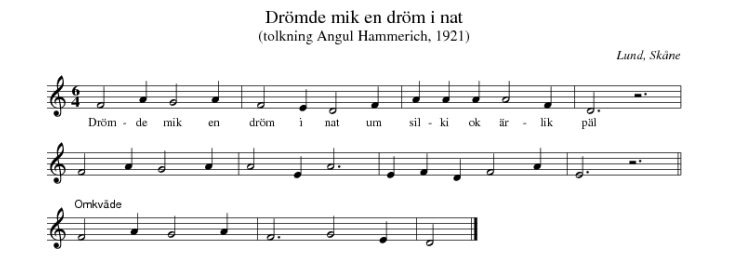 Но есть, например, древняя запись о композиции «Drømde mik en drøm i nat». Запись эта датируется 14-ым веком, но сама песня, вероятно, намного старше (это очень в духе средневековых скандинавов — фиксировать через несколько веков то, что бытовало ранее). Давайте рассмотрим эту песню в качестве примера.