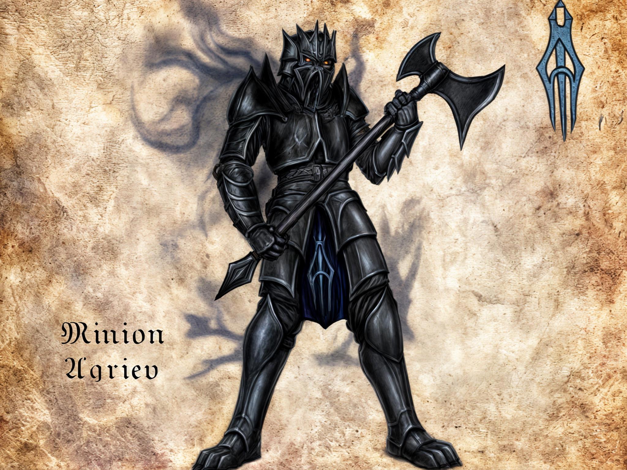 Миньоны являют собой воинов, павших в битве Тысячи магов. Каждая из трех магических гильдий: агриев, авиранцев и кустогонийцев в тайне от правящих королей развивала и ширила свою личную армию. Про то стало известно лишь когда Верховный магистр гильдии агриев Эольдер поверг в хаос междоусобицы сопредельные Асагриону королевства. В назначенный час, тайно служившие магам наемники облачились в магическую броню с геральдикой гильдий и сошлись в битве за власть магистров. К счастью, все они были уничтожены в Асагрионе в момент возникновения Разлома, но как оказалось, не окончательно. Неведомо где и как обрел такую великую силу некромант Амерон, но ему удалось не только отыскать истерзанные души, но и поставить их себе на службу. Миньоны в отличие от прочей нежити, поднятой им не могут быть изничтожены полностью, поскольку являют собой более духов, нежели живую плоть и способны пребывать среди живых доколе у некроманта хватит сил удерживать магическую "узилище" - особого рода заклятие, которое позволяет призывать в мир тех, чьи тела уже истлели. От того, мечей и прочего холодного оружия миньоны не страшатся, поскольку навредить оно может лишь их оболочке, но не алчущему крови духу. Временную гибель миньону приносит лишь уничтожение "узилища", кое, подобно магическому кокону скрывается за черненой зачарованной броней. Сама броня источает черные клубы дыма, происхождение которого неведомо, но даже на храбрых воинов наводит страх и зачастую укрывает от их глаз предательские удары миньона. Некоторые мудрецы склонны считать, что дым этот наведен самим Амероном, но так же существует куда более страшная версия, широко распространенная среди тех, кто встречал миньонов лично и сумел выжить. Согласно ей дым испускает тлеющая под броней душа все еще пылающая в магическом пламени, пожравшем Асагрион.