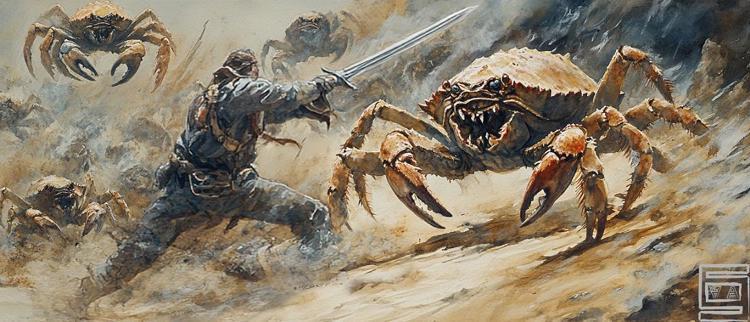 Даг двинулся навстречу, пригнувшись, чтобы не издавать шума. Увы, но на каменистой земле это было не так-то и просто, и выкатившийся из под ноги камушек привлек внимание членистоногих драчунов. Первый краб резко бросился навстречу, размахивая клешнёй. Удар рассёк воздух, но человек успел отклониться и рубанул мечом по суставу. С хрустом лапа отлетела, и краб закричал пронзительным воплем, напоминающим матерный ор на неизвестном языке.
