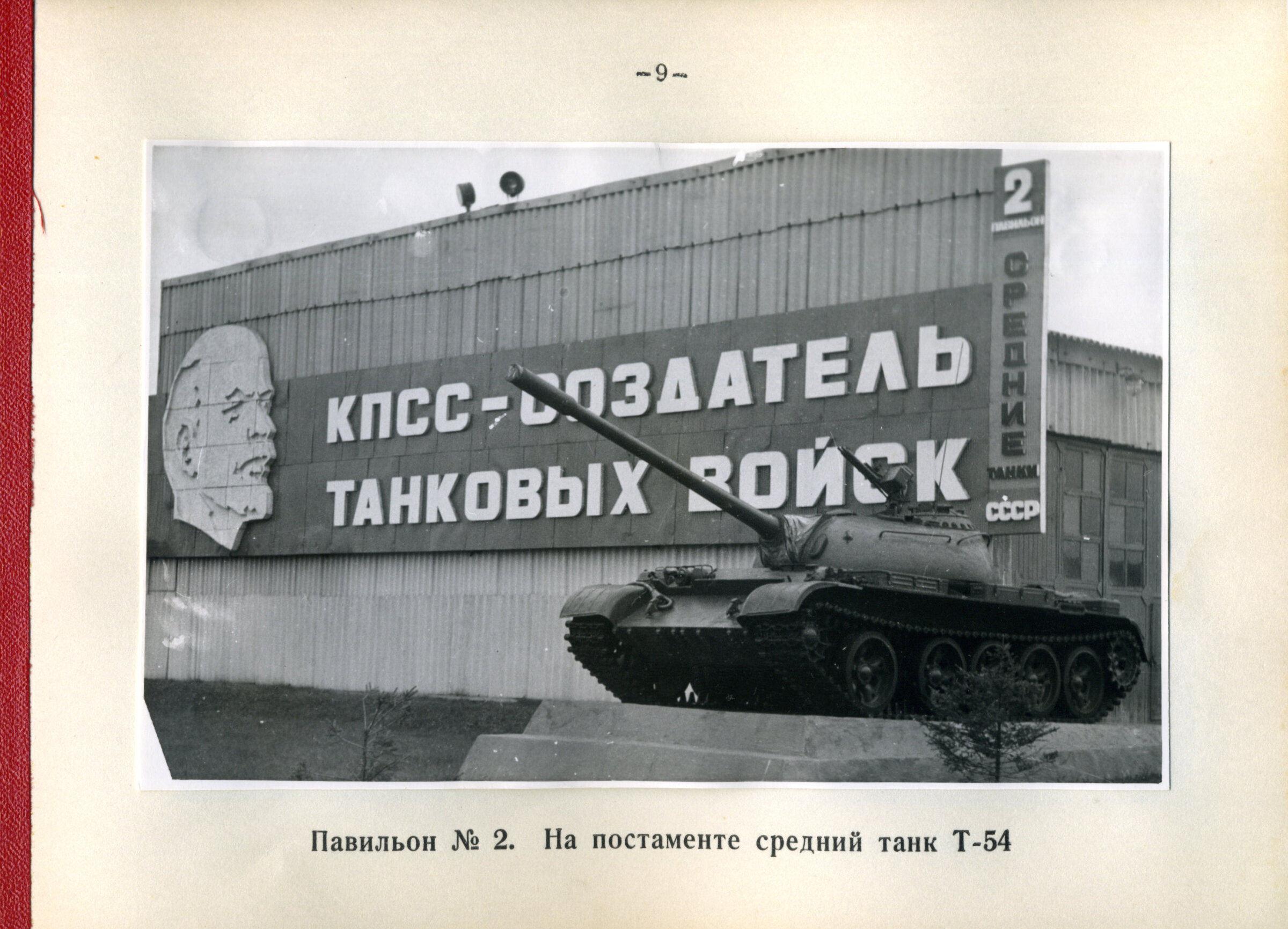 Павильон «Средние танки СССР». Транспарант на павильоне: «КПСС — создатель танковых войск».