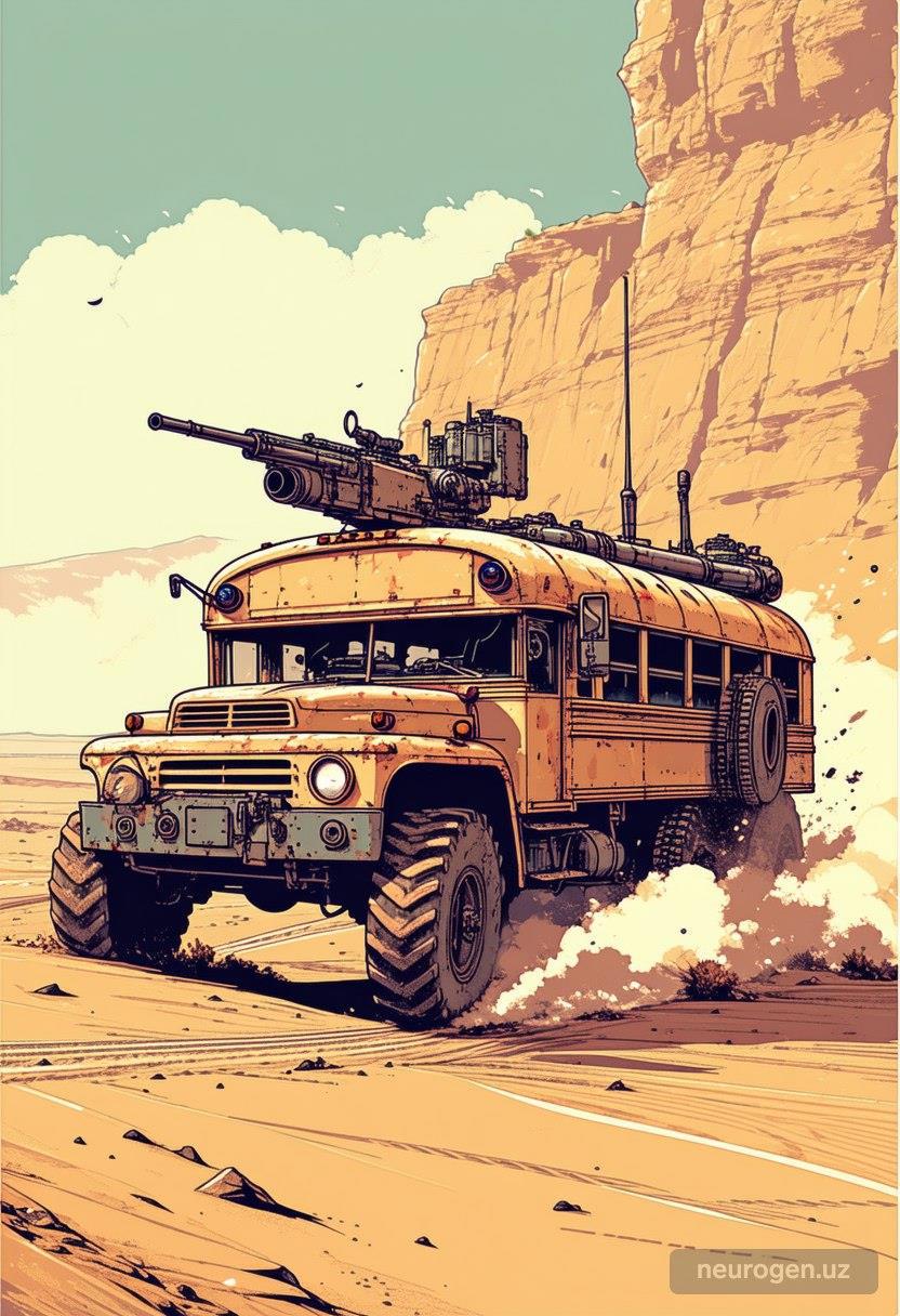 Надо отдать должное - у пацанов была серьёзная бибика. Неподалёку припарковали, в большом ангаре. Соорудили из школьного автобуса, умельцы. Корпус металлом проклепали. Колёса цепями обтянули и тоже закрыли листами. По бокам – амбразуры, из них - стволы пулемётные высовываются. На крыше солнечные батареи сверкают и прожектор, с электровоза. Сзади – башня с пушкой. Короткой, тупорылой. Спереди – таран. Бронеплиты скошены, чтоб пули отскакивали, умно придумали. И, конечно, символ банды на боку криво напшикан. Ворона, топор, лопата - «Хватай и улетай». Кратко. Практично. Как жизнь в наше время.