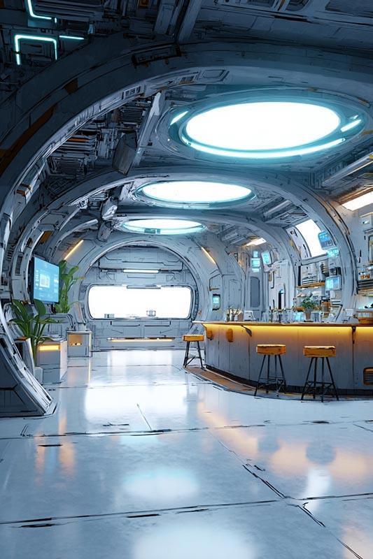 Кают-компания в проекции — стодвацатиградусный сектор. Как кусок сыра, но выглядит полностью круглой. Эффект достигается за счёт того, что сходящиеся в центре стены представляют собой видеоэкраны, куда транслируется картинка из двух других кают-компаний. Планировка специально сделана так, что подойти вплотную к стене нельзя, визуально сектора разделены столами, диванами, кухонным оборудованием и так далее. Кофемашина у каждого своя, но пространство общее. «Коммуникативное пространство», пребывание в котором является обязательным для всех членов экипажа. За исключением личного времени и сна. Во избежание «окукливания» и разобщённости.
