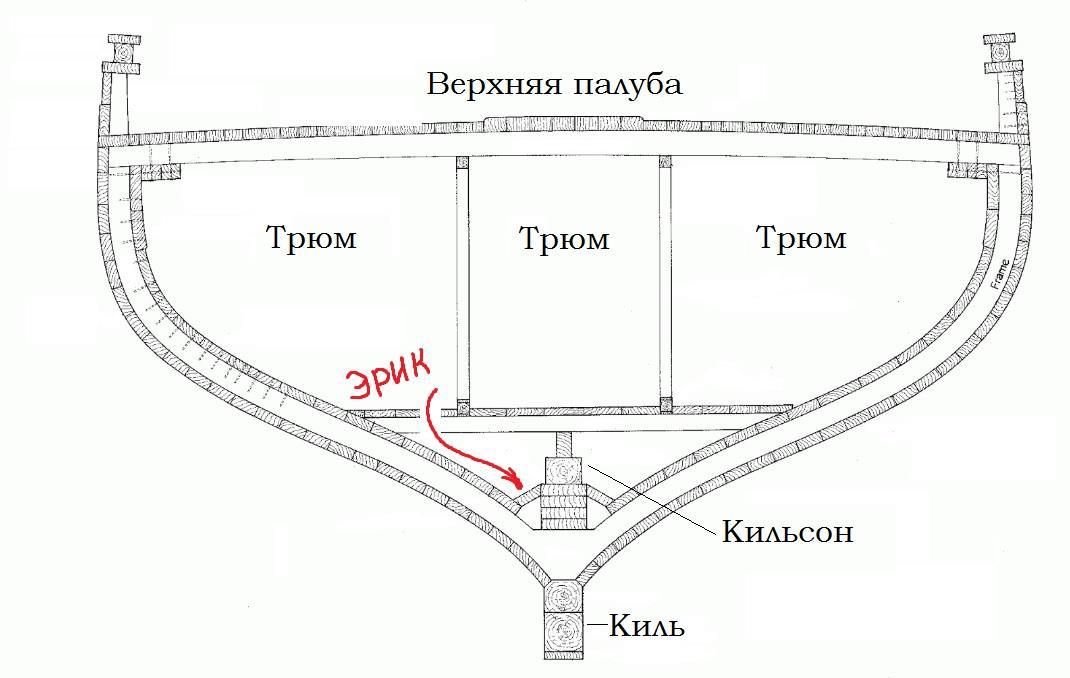 Юноша оказался в частично заполненном водой пространстве, образованном сходящимися к килю бортами и килевым брусом, оканчивавшимся кильсоном. Здесь царила абсолютная тьма. Эрик попытался вскочить и ударился головой о низкий подволок. Однако холодная подтрюмная вода несколько привела его в чувства, загнав магическую боль куда-то вглубь костей. Эрика с головой захлестнуло волной. Он рывком приподнялся, опёршись на локти, и принялся с шумом откашливаться.