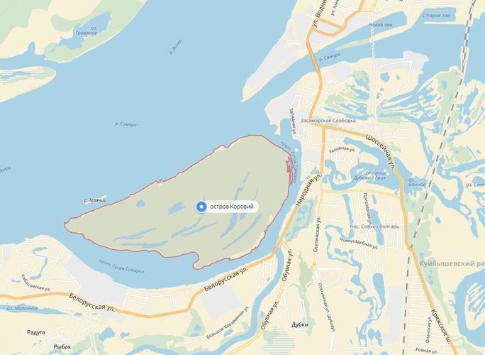 Носит он донельзя прозаическое название Коровий. Находится в западной части города, где тёмные воды скромной реки Самары сливаются с могучей Волгой. С юга его пределы ограничивает протока Сухая Самарка. Ныне мало кто из горожан о нём вспоминает, ибо остров ничем не примечателен, добраться до него нелегко, он основательно зарос кустарником и невысокими деревьями, и действительно весь покрыт зеленью (кроме зимнего периода, конечно). Странно было прочесть в путеводителе «Жигулевская кругосветка» (составитель А. Соболев, 1965 г.), что «Коровий остров - место излюбленного отдыха горожан…» Оставим сие на совести автора. А вот рыбаки посещают островок довольно охотно.