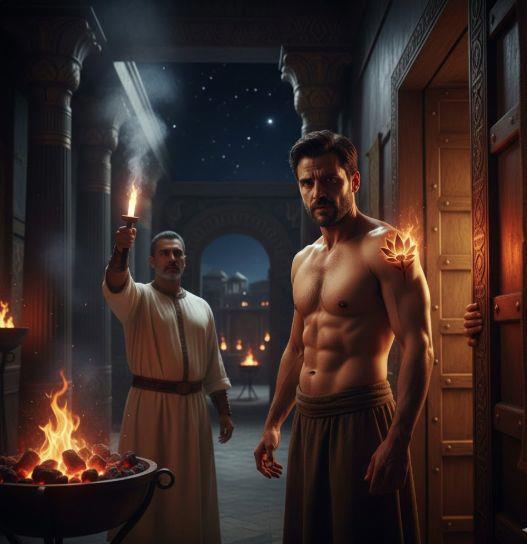 Меня ввели в комнату, где воздух был тяжёлым и горьким от дыма. В жаровне угли светились, как глаза демонов в преисподней. Жрец в белых одеждах поднял из огня раскалённое железо. Конец металла был белым, почти прозрачным от жара.