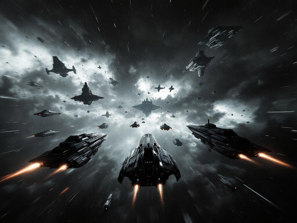 Космический флот, состоящий из четырёх мощных кораблей, медленно продвигался сквозь тёмную пустоту космоса. Линкор "Молния", ведущий эскадру, был похож на гигантского морского хищника, с угловатыми формами и массивным корпусом, затемнённым словно под покровом тьмы.
