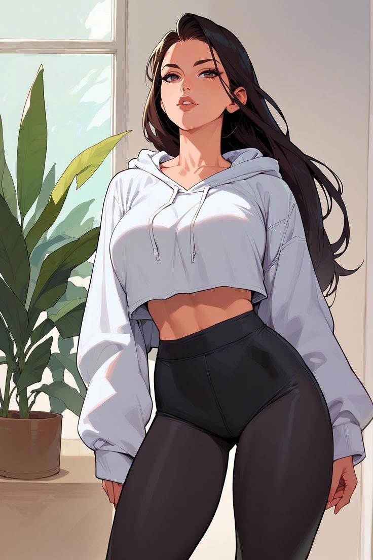 Из кухни вышла Мария с подносом в руках. На нём стоял горячий яблочный пирог, от которого шёл манящий пар. Её тёмные, густые волосы свободно спадали по плечам, а тёплый взгляд карих глаз излучал спокойствие. Она была одета в светлый свободный свитшот и тёмные леггинсы, которые подчёркивали её утончённую фигуру. В её движениях чувствовалась лёгкость и уверенность — в образе Марии была сочетана строгая элегантность и естественная женственность.