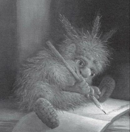 На рисунке было нечто, похожее на переплетение нескольких клочков –комочков паутины, с явно обозначенными четырьмя конечностями и бусинками – ежевичками больших глаз, выделявшихся на чем - то вроде вытянутой, как у ежика, мордочке, венчавшей фигурку.