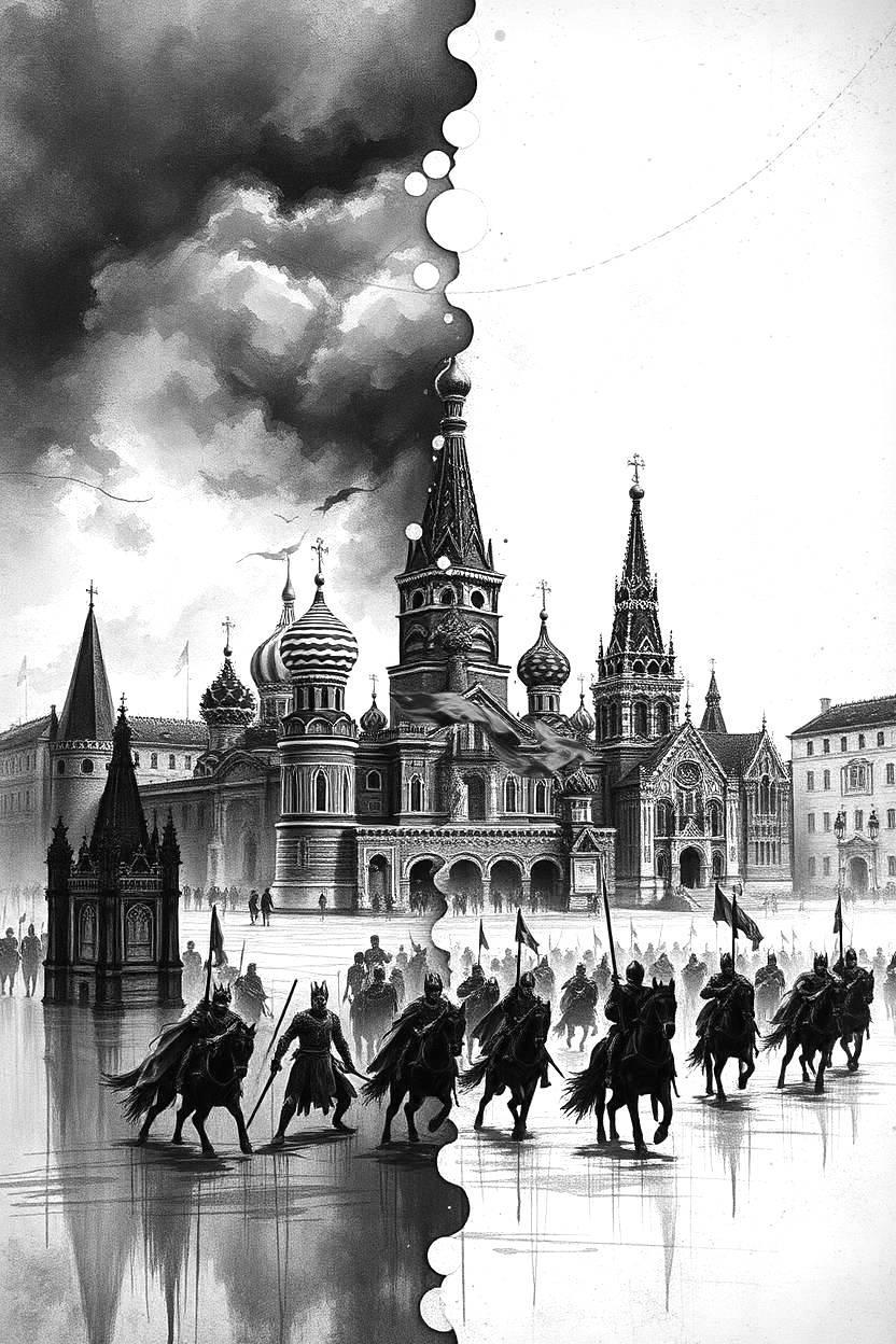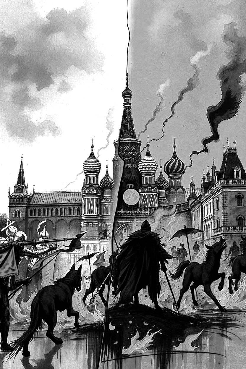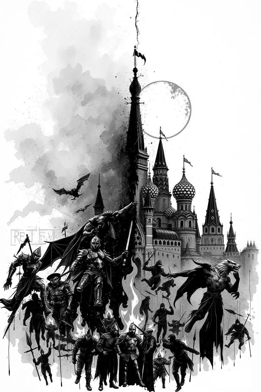 По всему московскому горизонту над Кремлём сверкали магические молнии и были видны сполохи взрывов дымных файерболов. Могучие «воздушные кулаки» и «тараны», каждый из которых был способен разом снести пол-Москвы, безжалостно крушили готические рыцарские замки и башни древних крепостей. Свирепые удары тяжёлыми боевыми мечами, разрубающими тела в железных латах и вдоль, и поперёк, и наискосок. Острые копья рвали человеческую плоть! Звенящие смертью спущенные тетивы боевых луков. Стрелы без счёта летали тучами и торчали, уже казалось, отовсюду. Отрубленные пальцы, головы, руки и ноги ковром буквально устилали брусчатку Красной Площади. Беззвучно ржали и вставали на дыбы красавцы боевые кони! Кровь текла рекой!